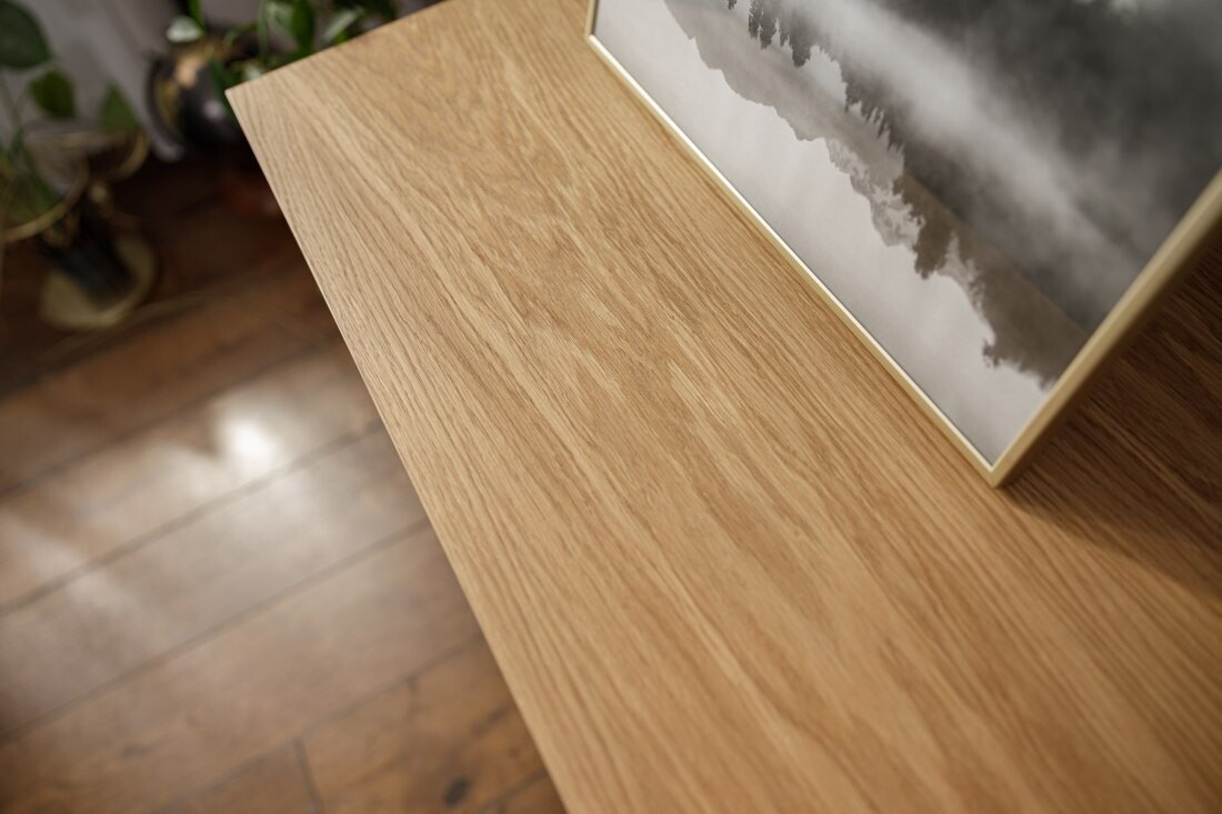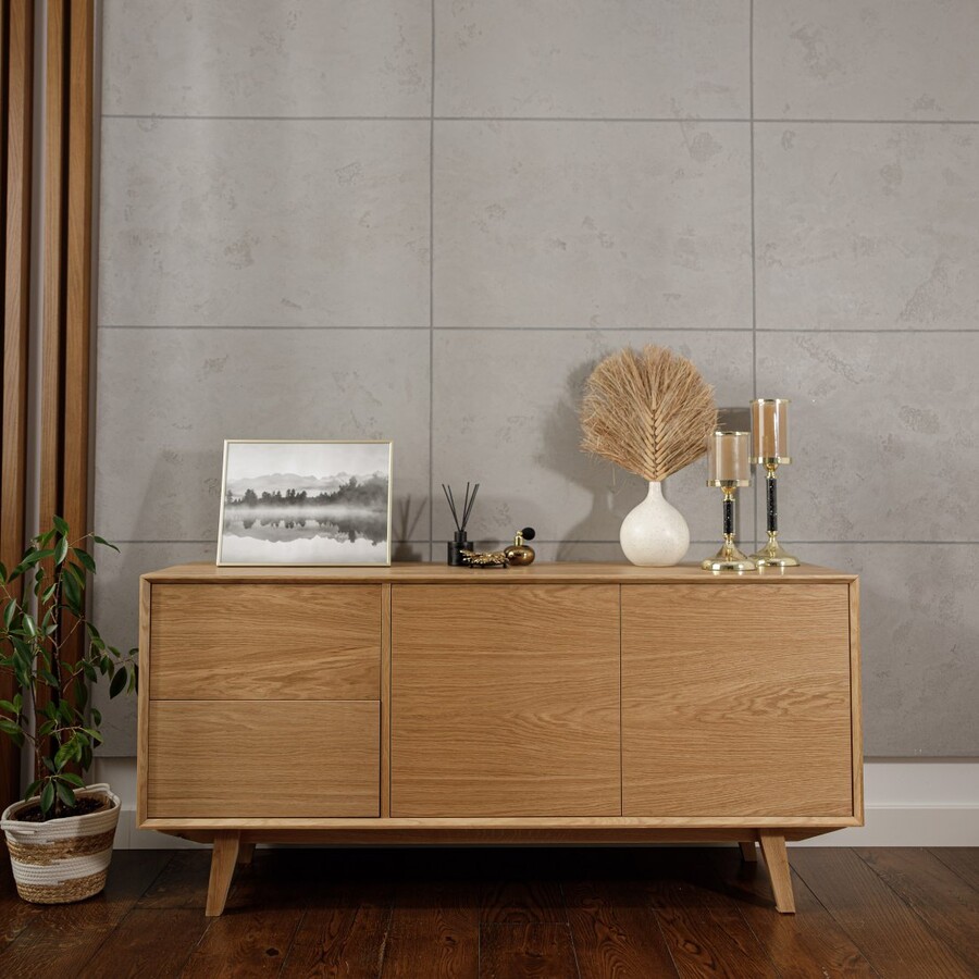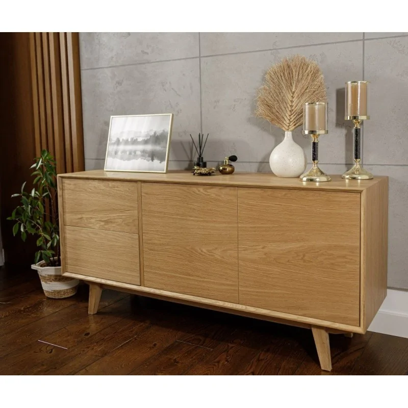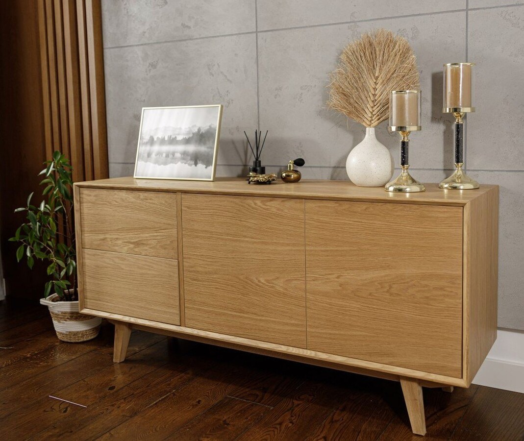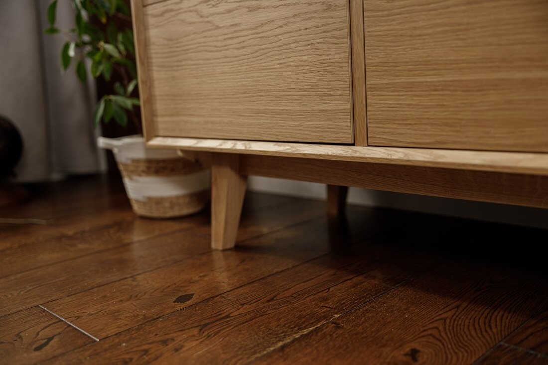 Mebel został wyposażony w system push-open z niezawodnymi zawiasami Blum, który zapewnia komfortowe i płynne otwieranie drzwiczek i szuflad przy delikatnym naciśnięciu. Lewa strona komody mieści dwie praktyczne szuflady oraz szafkę, natomiast prawa część skrywa dwie przestronne komory za pełnymi frontami. Zarówno korpus, jak i fronty wykonano z wysokiej jakości płyt fornirowanych naturalnym dębem, co gwarantuje trwałość oraz estetykę zbliżoną do litego drewna. Wykończenie bez widocznych okuć wzmacnia minimalistyczny charakter mebla, podkreślając jego szlachetną prostotę.