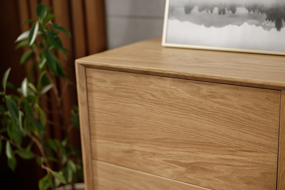 Komoda Skog prezentuje się jako model pełen czystej, naturalnej elegancji, której siła tkwi w prostocie i proporcjach. Jej fronty pozbawione uchwytów tworzą idealnie gładką płaszczyznę, w której główną rolę gra subtelny rysunek słojów dębowego forniru. Ciepły, naturalny odcień drewna harmonizuje z delikatnie skośnymi, drewnianymi nogami, które podnoszą korpus i nadają mu wizualnej lekkości. Całość zyskuje ponadczasowy charakter, który doskonale współgra zarówno z wnętrzami w stylu skandynawskim, japandi, jak i bardziej klasycznymi aranżacjami.