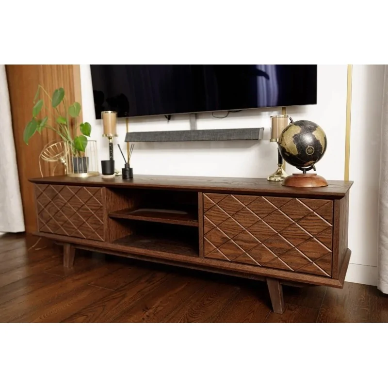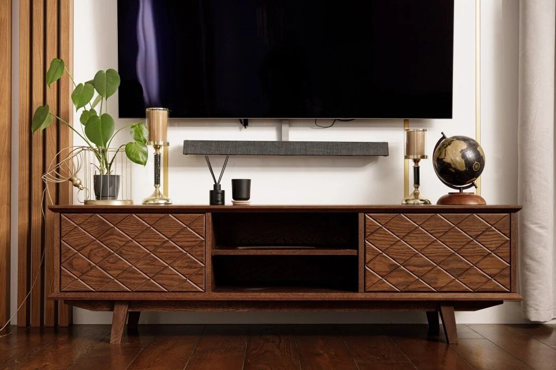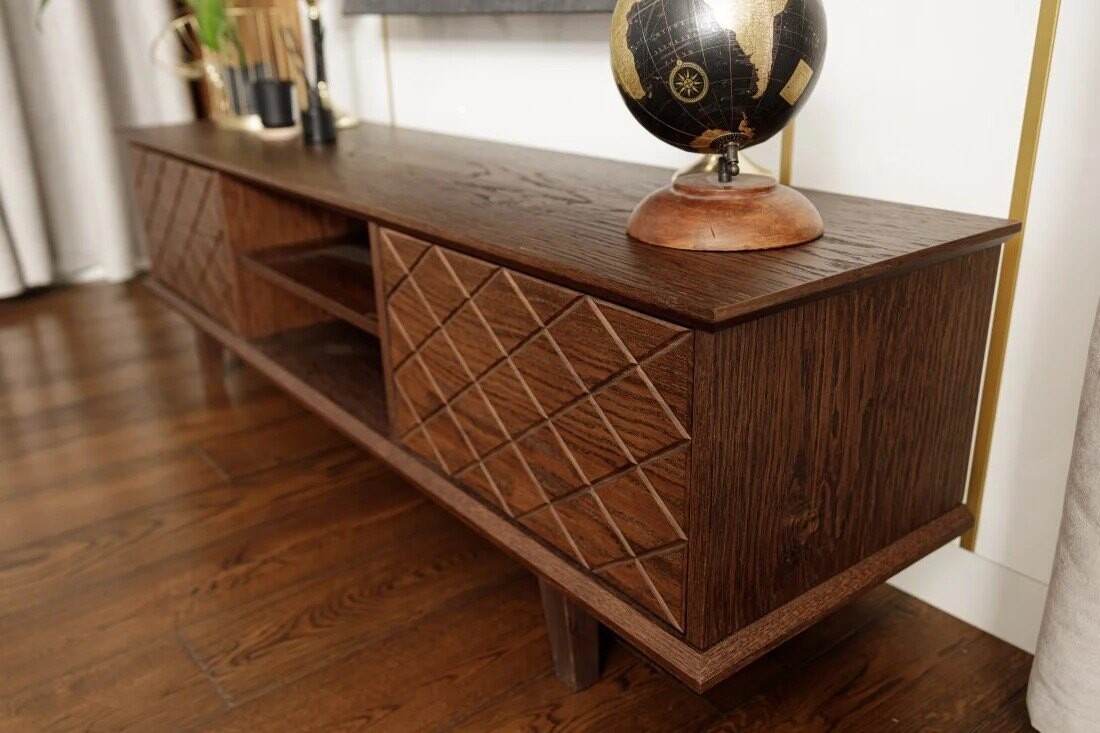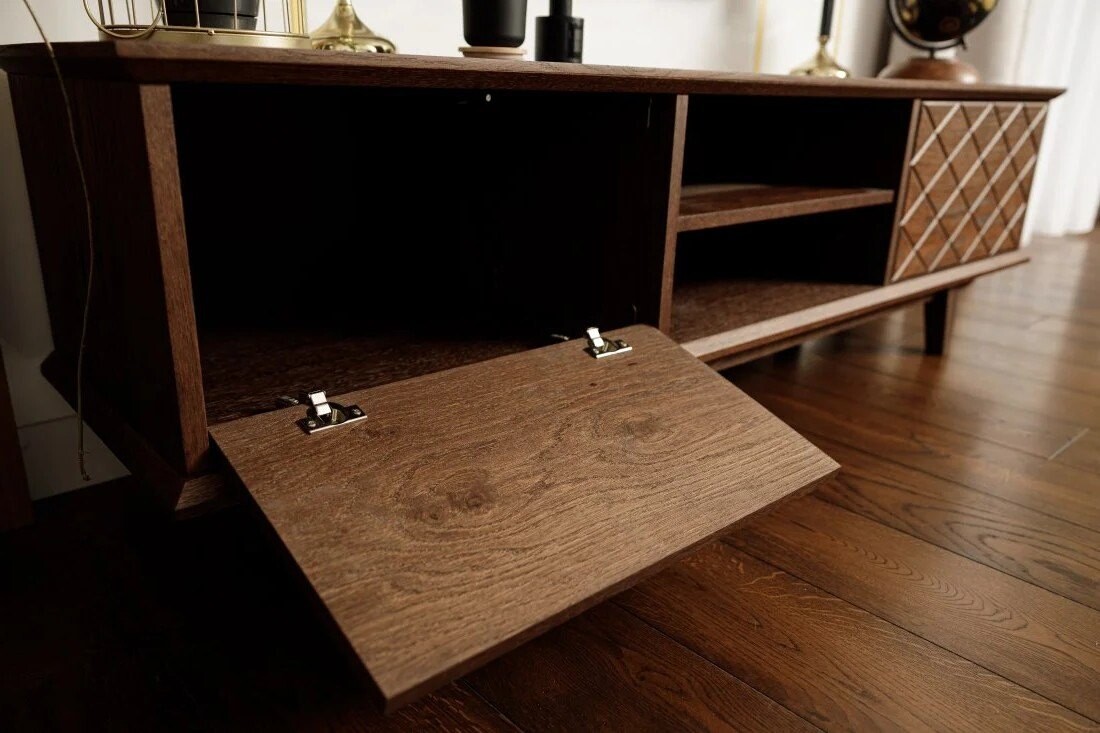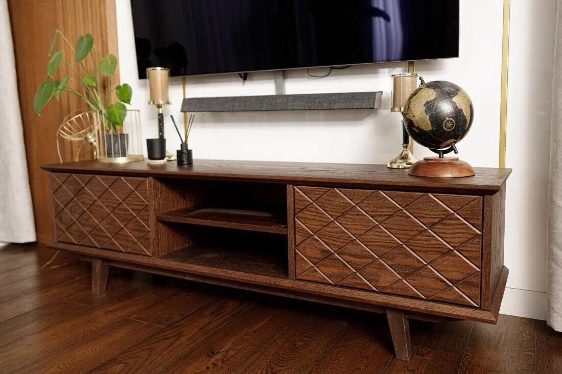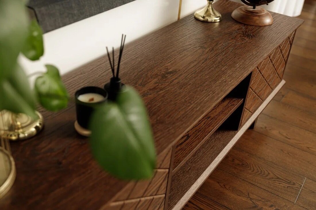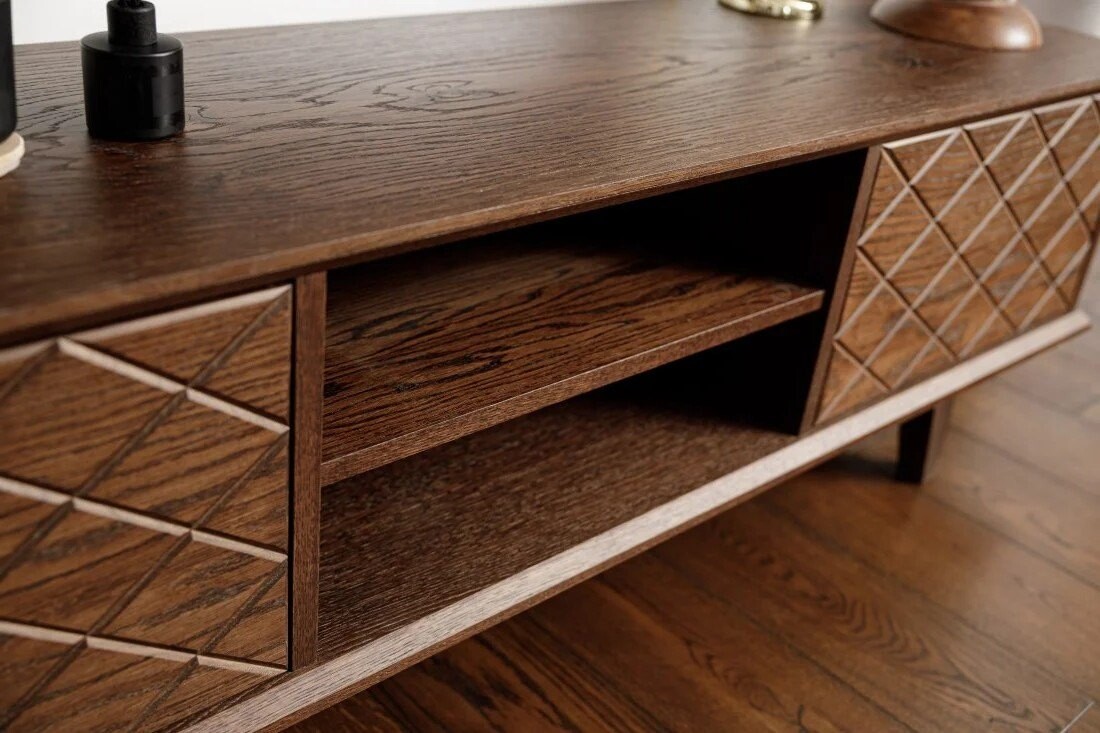 Fronty komody Jord przyciągają uwagę misternym, ręcznie wykończonym wzorem w romby, który dodaje bryle głębi i niebanalnego charakteru. Ciemne, naturalne wybarwienie drewna w połączeniu z widocznym usłojeniem tworzy elegancką całość, której ponadczasowy wygląd sprawdzi się w wielu aranżacjach – od klasycznych, przez industrialne, aż po japandi. Centralna część z otwartymi półkami zapewnia miejsce na sprzęt RTV i ułatwia prowadzenie kabli.