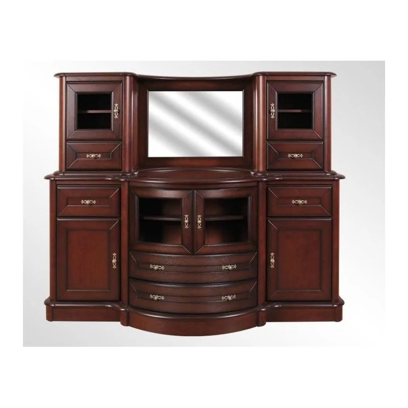 Komoda Nefryt z nadstawką wpasuje we wnętrza klasyczne i retro. Przepiękny, elegancki mebel uzupełniający przestrzeń salonową, jadalnianą, a nawet gabinetową. Wypukła, centralna część odznacza się i emanuje niezwykłą wykwintnością. Cała komoda stoi na klasycznej i solidnej podstawie. Dwie szuflady i oszklona szafka składają się na dolną, środkową część. Boki urozmaicone zostały symetrycznymi szafkami i szufladami. Nadstawka jest tutaj najważniejszym i najbardziej skupiającym uwagę elementem. Mebel jest masywny i wysoki, idealnie odzwierciedla inspirację bogatym stylem klasycznym i retro. Piękna sylwetka ekskluzywnej komody Nefryt zapewnia dużo miejsca na wszystkie rzeczy, które wymagają schowania. Możliwość wyboru wybarwienia daje użytkownikom pewność, że dopasują kolorystycznie komodę do panującej już aranżacji i gustu domowników. To jeden z tych mebli, które wybiera się na wiele, wiele lat. Będzie ceniony więc przez wszystkich, dla których priorytetem jest wybór mebli z charakterem, ale i niezwykle trwałych i solidnych zarazem.