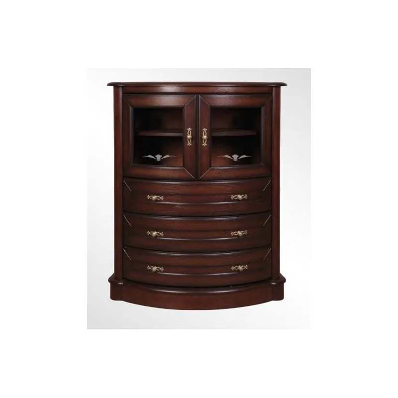 Luksusowa komoda, która podkreśli piękno naszych dekoracji? To z pewnością drewniana propozycja o pięknej nazwie Nefryt. Ta komoda wywoła mnóstwo pozytywnych emocji i wniesie do każdego wnętrza luksus i niepowtarzalny styl. Drewno ma w sobie pewną historię i jest gwarancją długowieczności. Spójrzmy na nią. Jej sylwetka jest w nieco wypukła, przez co jest meblem nietuzinkowym i oryginalnym. Masywna i solidna podstawa prezentuje się gustownie. Wyżej mamy trzy szuflady ozdobne rzeźbieniami i pięknymi uchwytami. Najwięcej przykuwa jednak górna część komody. Jest nią szafka z przeszklonymi drzwiami. Standardowo otwierana, skrywa za sobą półki na nasze dekoracje. Nie możemy nie wspomnieć o błyszczącym i bardzo gładkim blacie, na którym kwiaty w wazonie i ramki ze zdjęciami będą prezentować się jeszcze piękniej i atrakcyjniej. Drewno, a także cały wygląd tej komody gwarantuje podwyższenie standardu każdego miejsca, w którym znajdzie się ten wykwintny i elegancki mebel. Niezależnie od tego, czy wybieramy całą kolekcję ekskluzywnych mebli „Nefryt”, czy chcemy tylko komodę, mamy gwarancję, że to najlepszy wybór. Na wiele, wiele lat.