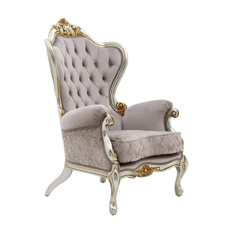 Pikowany fotel z rzeźbą Retiro to esencja barokowego przepychu, który łączy w sobie bogato zdobioną formę z wyjątkowym komfortem. Wysokie, stylizowane oparcie ozdobione klasycznym pikowaniem tworzy majestatyczną sylwetkę, a finezyjne rzeźbienia na górnej części dodają mu unikalnego charakteru. Delikatne złocenia na drewnianej ramie, przeplatające się z kremowym wykończeniem, nadają fotelowi luksusowego wyrazu. Siedzisko jest obszerne i miękkie, co zapewnia wygodę nawet podczas długiego użytkowania. Efektowne podłokietniki z wyraźnymi zdobieniami oraz subtelnie wygięte nogi dopełniają całości, tworząc mebel, który stanowi ozdobę każdej eleganckiej przestrzeni.