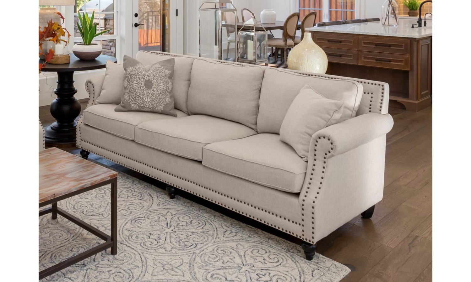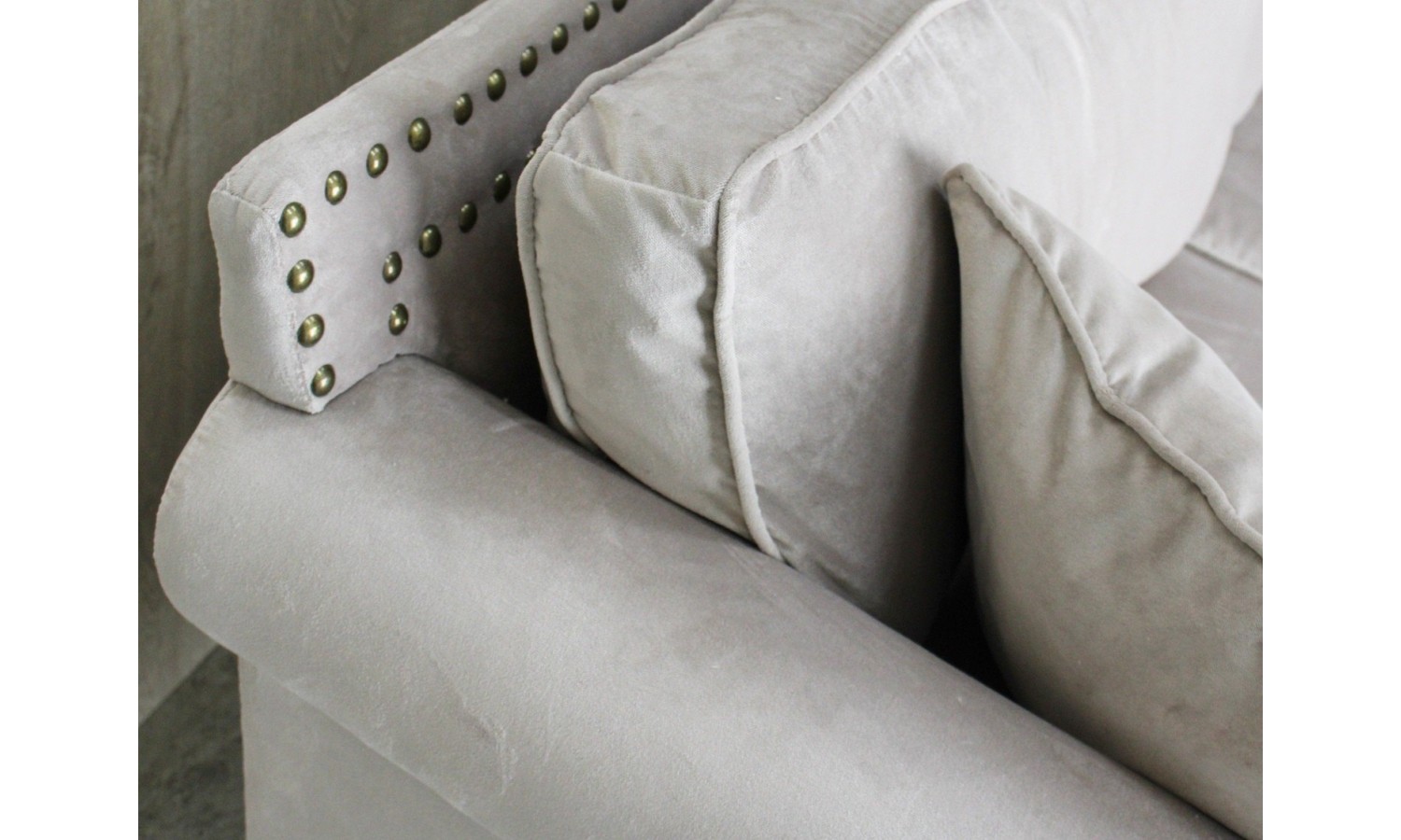 Sofa Mistral 220 cm ozdobiona eleganckimi ćwiekami stanowi serce każdego salonu, łącząc komfort z klasycznym stylem. Solidna konstrukcja z drewna i płyty zapewnia trwałość, a stylowe detale w postaci ozdobnych gwoździ dodają ponadczasowej elegancji. Neutralny kolor tapicerki sprawia, że sofa doskonale wpasowuje się w różnorodne style wnętrzarskie, harmonijnie komponując się z istniejącym wystrojem.