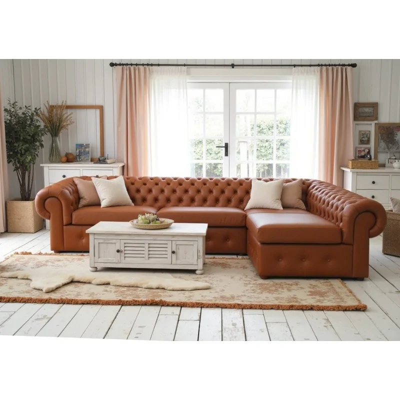 Narożnik Chesterfield Retro 330x195 cm prezentuje się niezwykle elegancko, stanowiąc wyjątkowy przykład stylowego mebla wypoczynkowego. Charakterystyczne, głębokie pikowania zakończone guzikami w odcieniu skóry naturalnej tworzą wyrafinowaną strukturę oparcia, która w połączeniu z szerokimi podłokietnikami i klasycznym układem narożnym nadaje całości ponadczasowego uroku. Naturalna skóra w ciepłym odcieniu koniaku nie tylko podkreśla luksusowy charakter mebla, ale także doskonale komponuje się z jasnymi i rustykalnymi aranżacjami wnętrz.