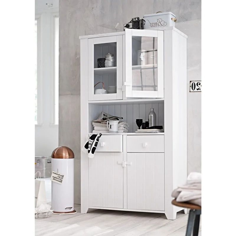 Kredens vintage Lorenz jest wyjątkowym meblem, który niezwykłym designem sprawi, że wnętrze całkowicie zmieni swój klimat, przenosząc się w przeszłość ku stylowej aurze dawnych domów. Mebel przyciąga uwagę niestandardowym rozwiązaniem, które kryje w sobie elementy stylu angielskiego i prowansalskiego, wyróżniających się prostym charakterem kompozycji i specyficznymi dekoracjami. W modelu zastosowany został tradycyjny podział na górną część przeszkloną i dolną zabudowaną. Interesujące są bardzo grube ścianki boczne mebla przechodzące w niewysokie, profilowane od wewnątrz nogi. Fantazyjnym dodatkiem jest zamknięcie dolnej szafki na skobel, tu w wersji nieco bardziej nowoczesnej. Górna przeszklona szafka to doskonałe miejsce na eleganckie naczynia, stylowe pojemniki i szkło. Dola część zamknięta pełnymi drzwiczkami pozwala na przechowywanie mniej efektownych rzeczy. W centralnej części kredensu znalazła się też głęboka wnęka z solidnym blatem, a poniżej para pojemnych szuflad.