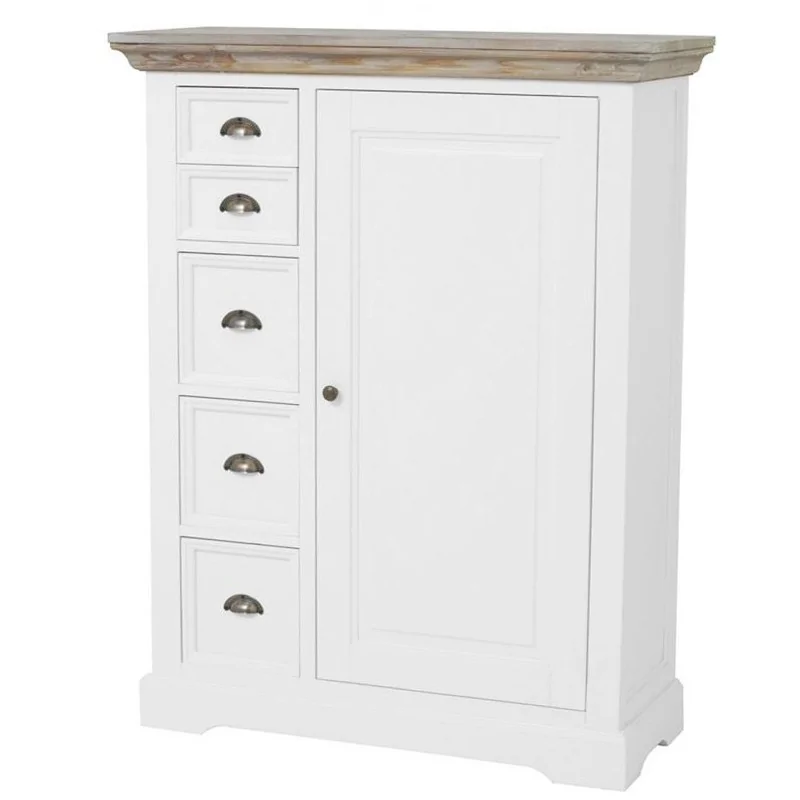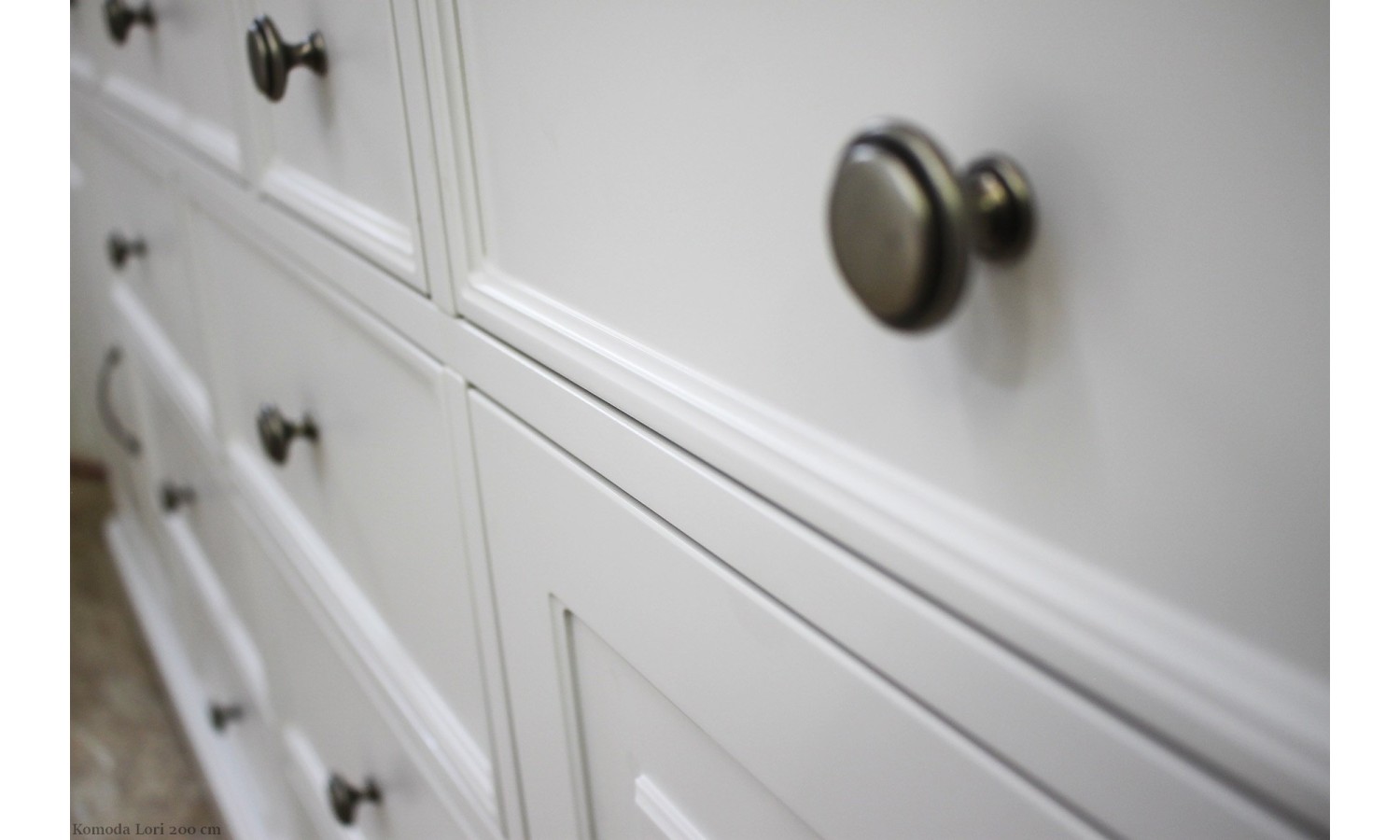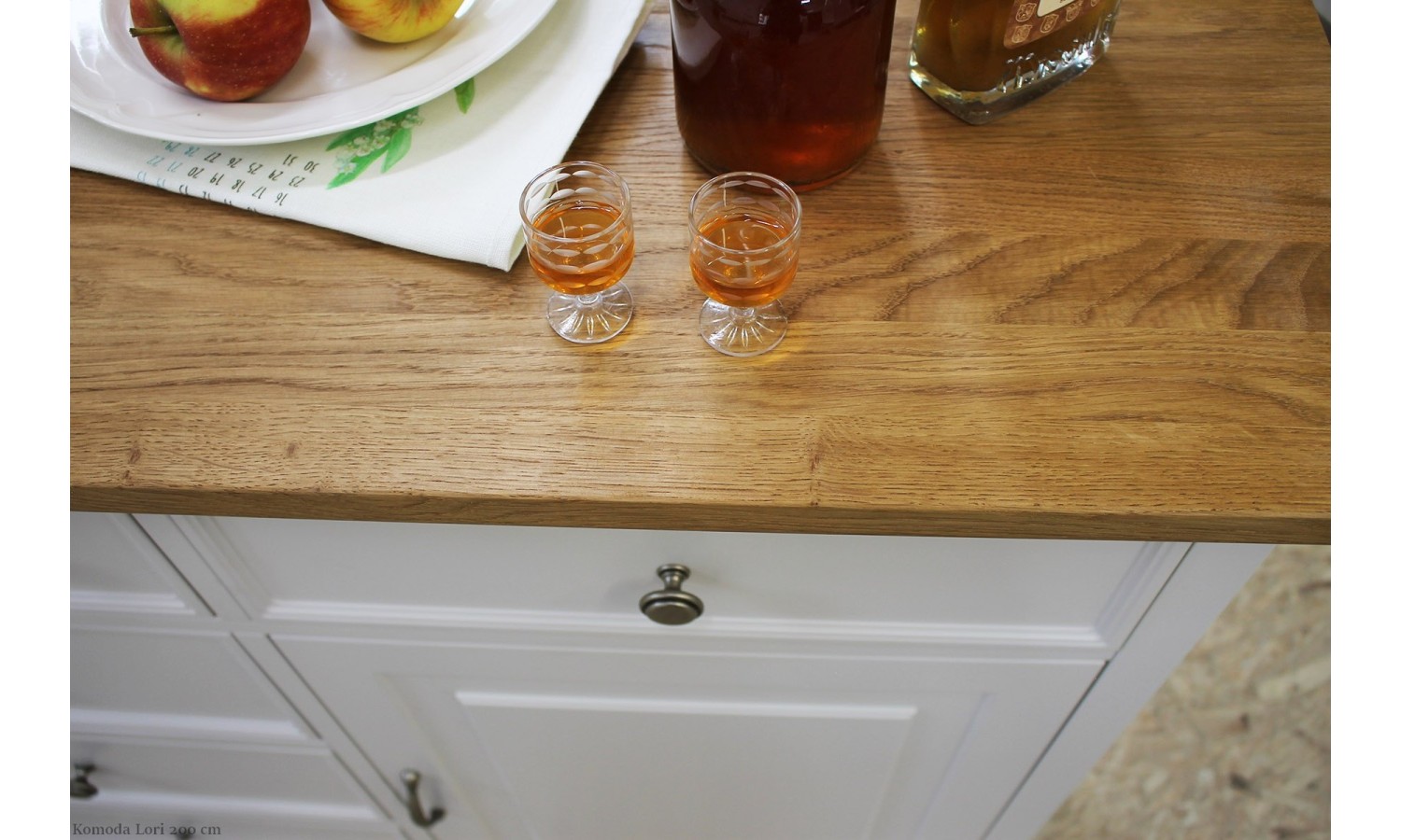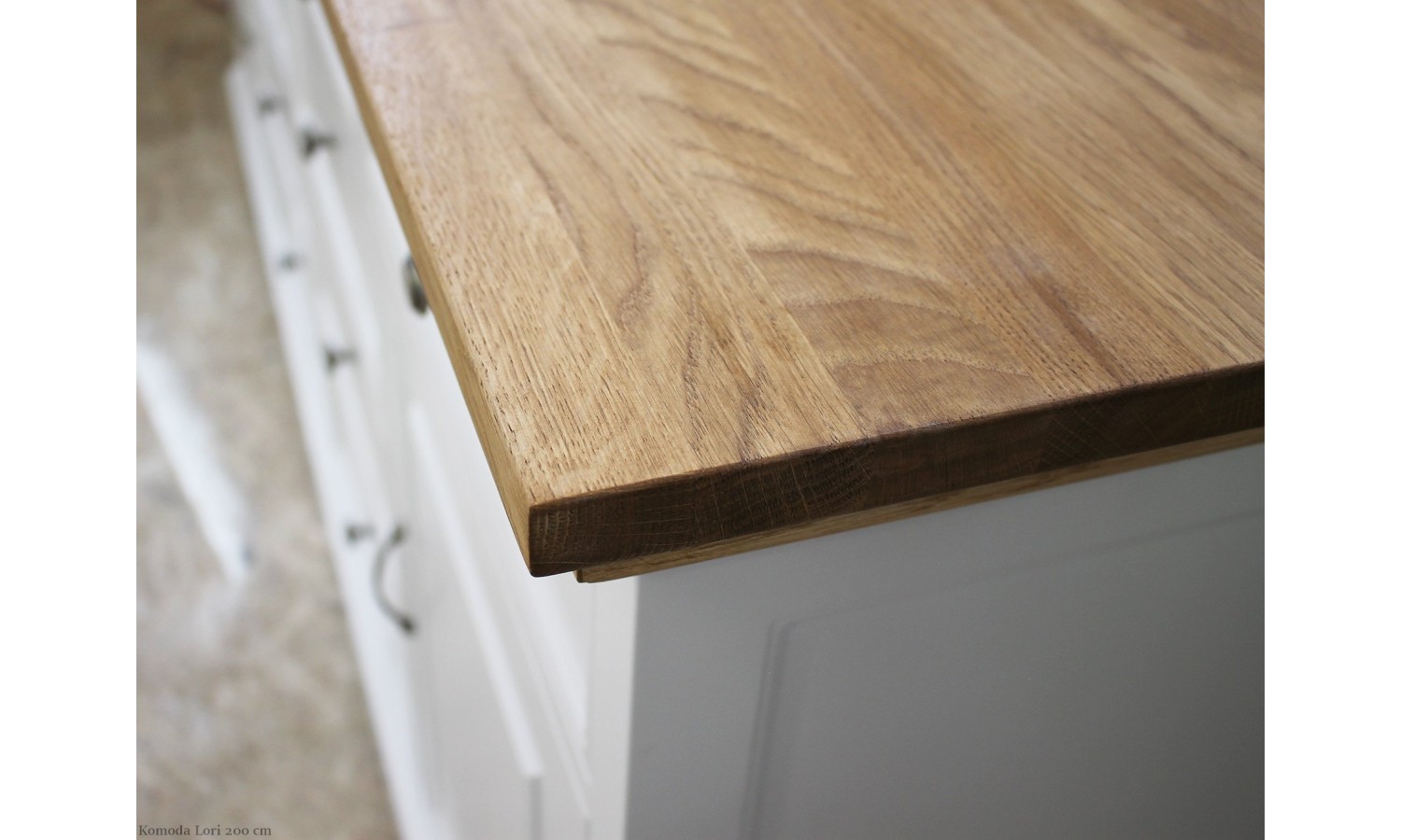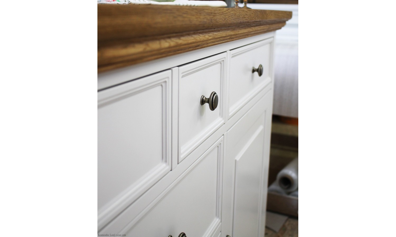 Biała komoda lakierowana Lori jest tym meblem, który pozwoli odświeżyć wspomnienia z odległego dzieciństwa i przywołać klimat wnętrz z tamtych lat. Mebel wykonany jest z litego drewna, co wyraźnie podkreśla zastosowanie solidnego blatu z niebarwionego dębowego drewna. Cała konstrukcja została pomalowana na kolor biały typowy dla mebli rustykalnych i vintage, tworząc ciekawe uzupełnienie klasycznej czystej bieli. Dębowy blat tworzy wrażenie bardzo grubego i ciężkiego dzięki umieszczeniu go na specjalnej ramie o wyokrąglonych krawędziach. To doskonałe miejsce do ustawienia kolekcji rodzinnych fotografii lub lampy stołowej. Biała komoda lakierowana jest niezbyt szeroka, ale stosunkowo wysoka, dlatego zapewnia wiele miejsca do zagospodarowania w swoim wnętrzu. Składa się na nie duża pojedyncza szafka zajmująca całą wysokość mebla, oraz umieszczona z lewej strony kolumna szufladek. Spośród pięciu z nich dwie położone najwyżej są najmniejsze i mogą być miejscem przechowywania podręcznych drobiazgów. Wysoki mebel nie traci na solidności, bowiem ciężaru optycznego dodaje mu masywna, szeroka podstawa z niewielkimi, łukowatymi wycięciami. Dzięki temu mebel unosi się nieco nad podłogą. Uroku retro dodaje kompozycji celowo postarzany blat oraz stylowe uchwyty szuflad.