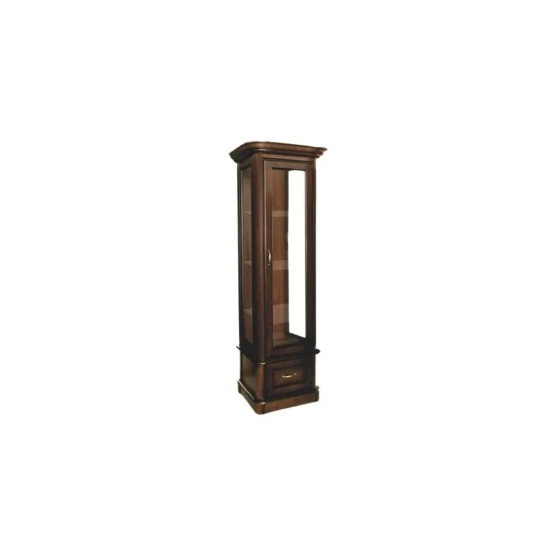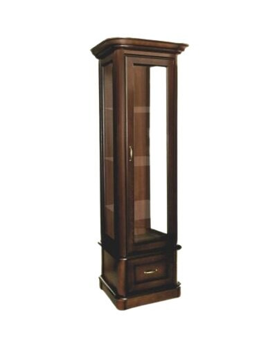 Przeszklona biblioteczka Szafir 1D1S to elegancki mebel, który świetnie eksponuje zawartość dzięki przeszklonym drzwiom. Wykonana z płyty fornirowanej, łączy w sobie estetykę i praktyczność. Posiada jedne drzwi i jedną szufladę, co pozwala na przechowywanie książek i innych przedmiotów. Klasyczny design z subtelnymi zdobieniami sprawia, że mebel pasuje do różnych wnętrz.
