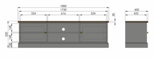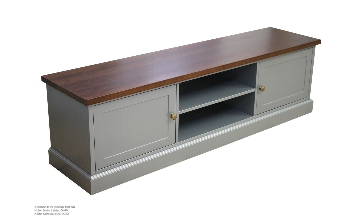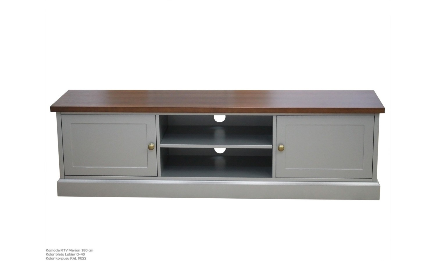 Komoda Marion to stylowy i funkcjonalny mebel, który łączy elegancję klasycznego designu z praktycznym wykorzystaniem przestrzeni. Niski, szeroki korpus osadzony na solidnej podstawie prezentuje się niezwykle stabilnie i estetycznie. Blat z litego drewna dębowego wyróżnia się pięknym, naturalnym usłojeniem, które nadaje całości szlachetny wygląd. Po bokach znajdują się dwie zamykane szafki, wyposażone w subtelne mosiężne uchwyty, które dodają meblowi charakteru. Środkowa część z otwartymi półkami została zaprojektowana z myślą o przechowywaniu sprzętu RTV, co czyni komodę idealnym rozwiązaniem do salonu lub pokoju telewizyjnego.