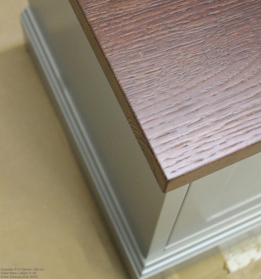 Korpus komody wykonany jest z wysokiej jakości płyty MDF oraz drewna, co zapewnia trwałość i solidność konstrukcji. Dzięki możliwości wyboru koloru wybarwienia z palety RAL lub ICA, mebel można idealnie dopasować do stylu wnętrza. Istnieje również opcja personalizacji wymiarów oraz układu wnętrza, dzięki czemu każdy egzemplarz może być dostosowany do indywidualnych potrzeb. Dekoracyjne frezowania na podstawie i frontach dodają całości klasycznej elegancji, czyniąc komodę ponadczasowym elementem aranżacji.