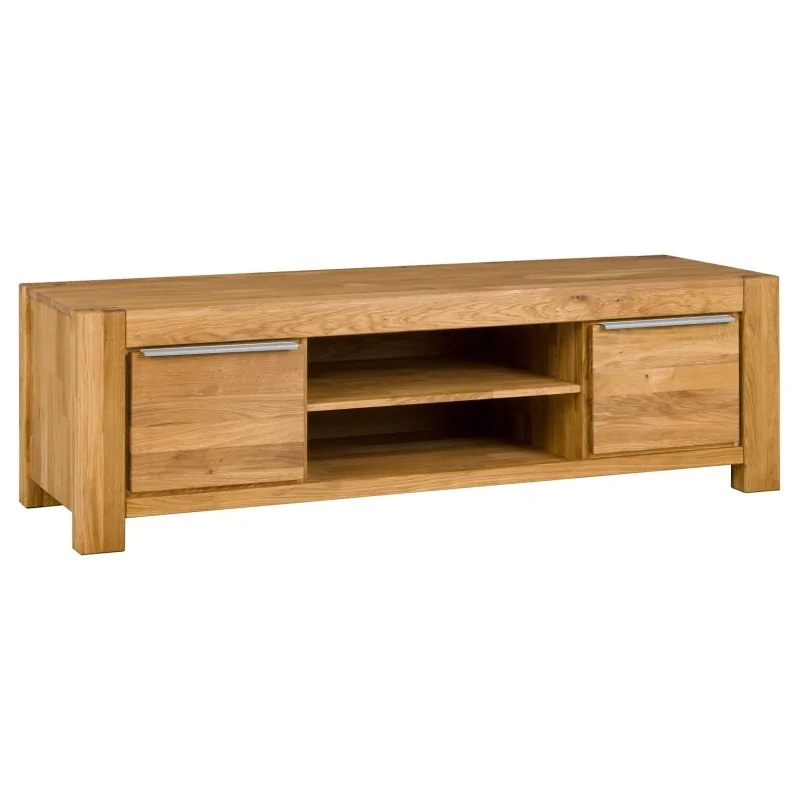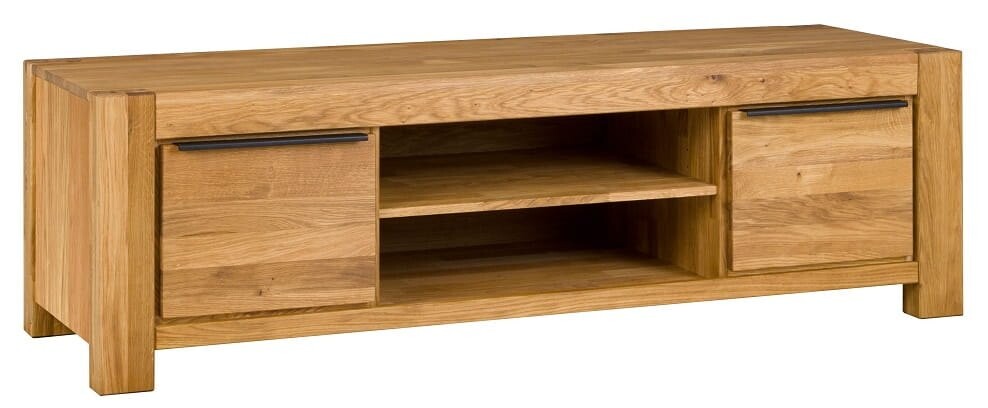 Solidna i elegancka szafka RTV Tina 2D wyróżnia się masywną konstrukcją wykonaną z naturalnego drewna dębowego. Jej prostokątna bryła podkreślona została grubymi nogami i szerokim blatem, który gwarantuje stabilność. Powierzchnia mebla eksponuje unikalny rysunek drewna, uwidaczniając naturalne słoje i delikatne przejścia kolorystyczne. Dwa boczne fronty ozdobione zostały metalowymi uchwytami, które doskonale komponują się z naturalnym materiałem, dodając nowoczesnego akcentu. Centralna część szafki zawiera otwarte półki, idealne na sprzęt RTV, konsolę do gier lub dekoracyjne elementy.