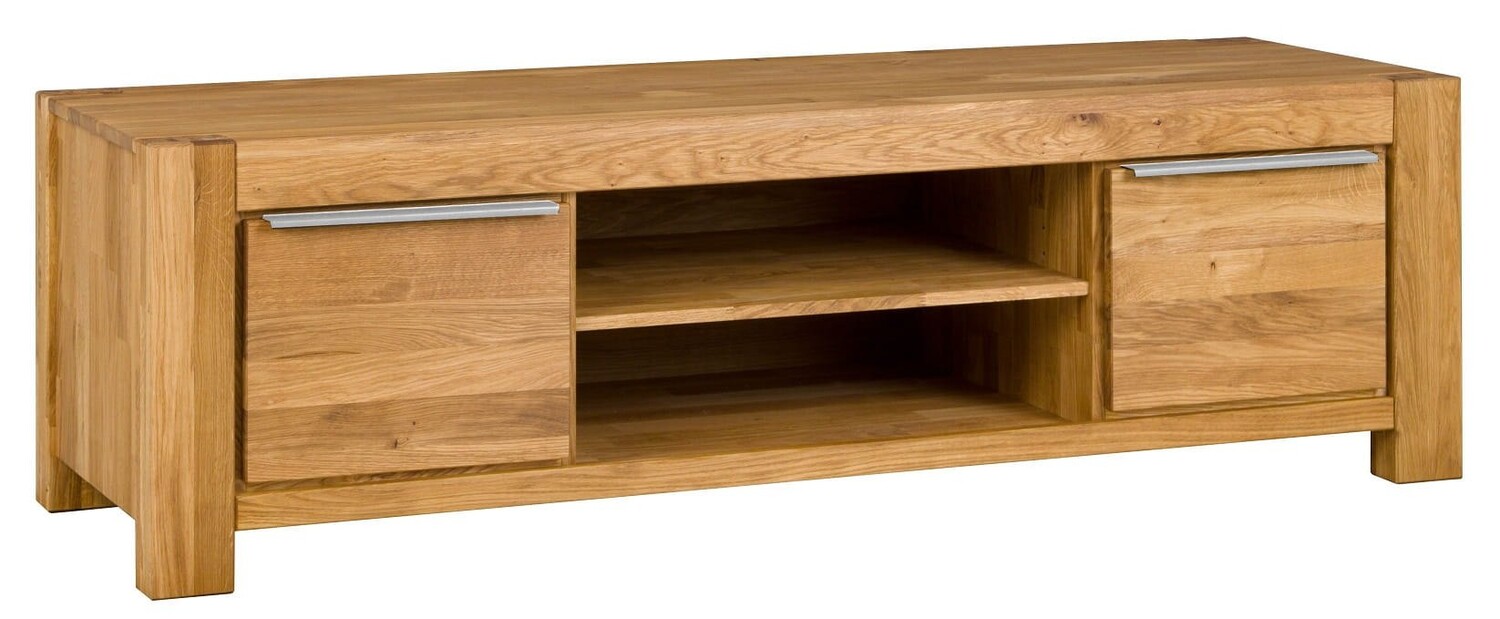 Mebel wykonano z litego drewna dębowego oraz płyty fornirowanej, co zapewnia wysoką odporność na uszkodzenia i długowieczność. Dodatkowe zabezpieczenie olejem podkreśla strukturę drewna, nadając mu subtelny połysk oraz chroniąc przed wilgocią czy drobnymi zadrapaniami. Ciepły odcień dębu sprawia, że szafka doskonale wpisuje się zarówno w klasyczne, jak i nowoczesne wnętrza. Pojemne szafki boczne oferują sporo miejsca na akcesoria domowe, piloty czy kolekcję płyt DVD.