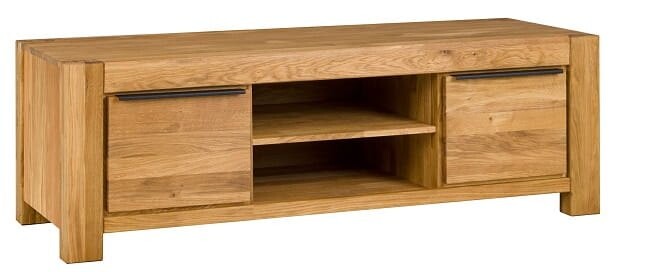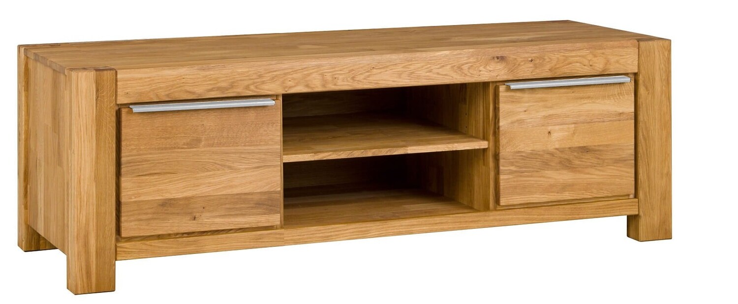 Komoda RTV Tina 155 cm to połączenie klasycznej elegancji z funkcjonalnością. Jej konstrukcja wykonana z litego drewna dębowego wyróżnia się solidnością oraz ciepłym, naturalnym wykończeniem. Gładka powierzchnia blatu eksponuje wyjątkowe usłojenie drewna, które nadaje meblowi niepowtarzalny charakter. Pojemne szafki boczne zostały wyposażone w nowoczesne metalowe uchwyty, dodające subtelnego kontrastu. Środkowa część to przestronne półki, idealne do przechowywania sprzętu RTV, książek lub dekoracyjnych akcentów.
