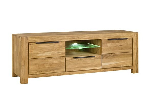 Komoda RTV Tina 193 cm to efektowne połączenie funkcjonalności i ponadczasowego designu. Wykonana z litego drewna dębowego, zachwyca naturalnym usłojeniem oraz ciepłym odcieniem, który wprowadza do wnętrza przytulny i elegancki klimat. Szeroka bryła komody została wzbogacona o szklane podświetlane półki, które dodają nowoczesnego charakteru i subtelnie eksponują ustawione na nich elementy. Boczne szafki oraz praktyczne szuflady zapewniają dużą przestrzeń do przechowywania, dzięki czemu wszystkie akcesoria będą zawsze pod ręką.