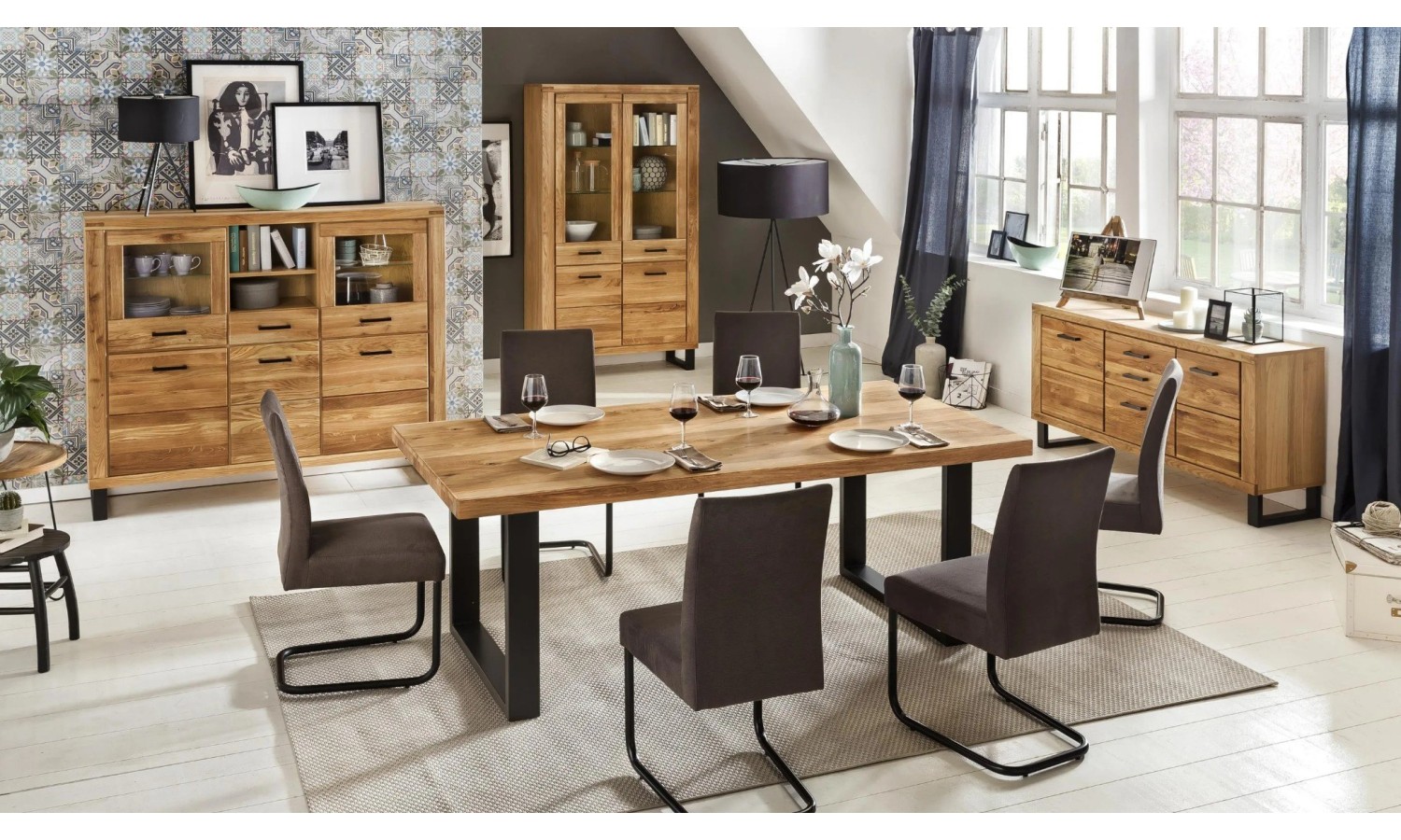 - Wykonany z litego drewna dębowego oraz płyty fornirowanej, co zapewnia trwałość i elegancki wygląd