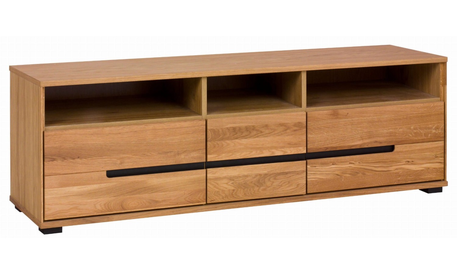 Szafka RTV Domo 162,5 cm to eleganckie i funkcjonalne rozwiązanie dla nowoczesnych wnętrz. Fronty z litego drewna dębowego wyróżniają się naturalnym usłojeniem, a olejowana powierzchnia podkreśla ich ciepły odcień. Trzy otwarte wnęki zapewniają łatwy dostęp do urządzeń multimedialnych, a ich przestronność umożliwia wygodne rozmieszczenie dekoderów, konsol czy sprzętu audio. Poziome czarne uchwyty harmonizują z naturalnym drewnem, dodając całości nowoczesnego charakteru.