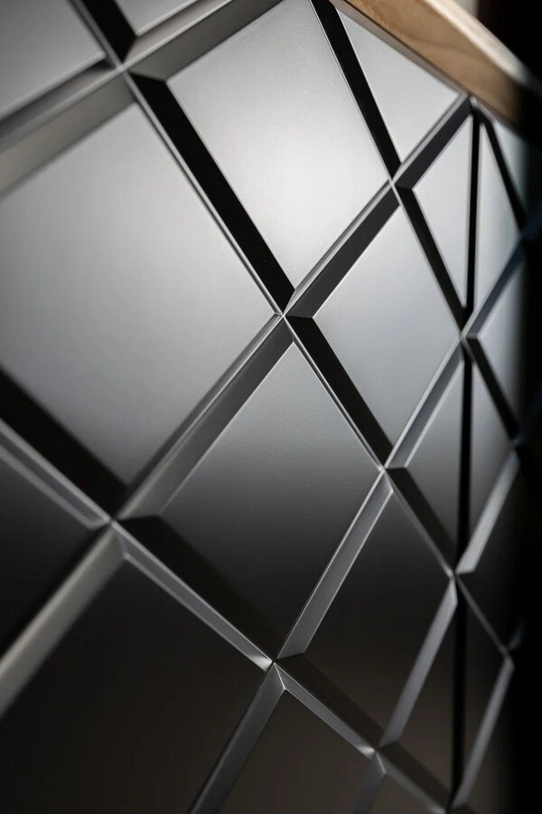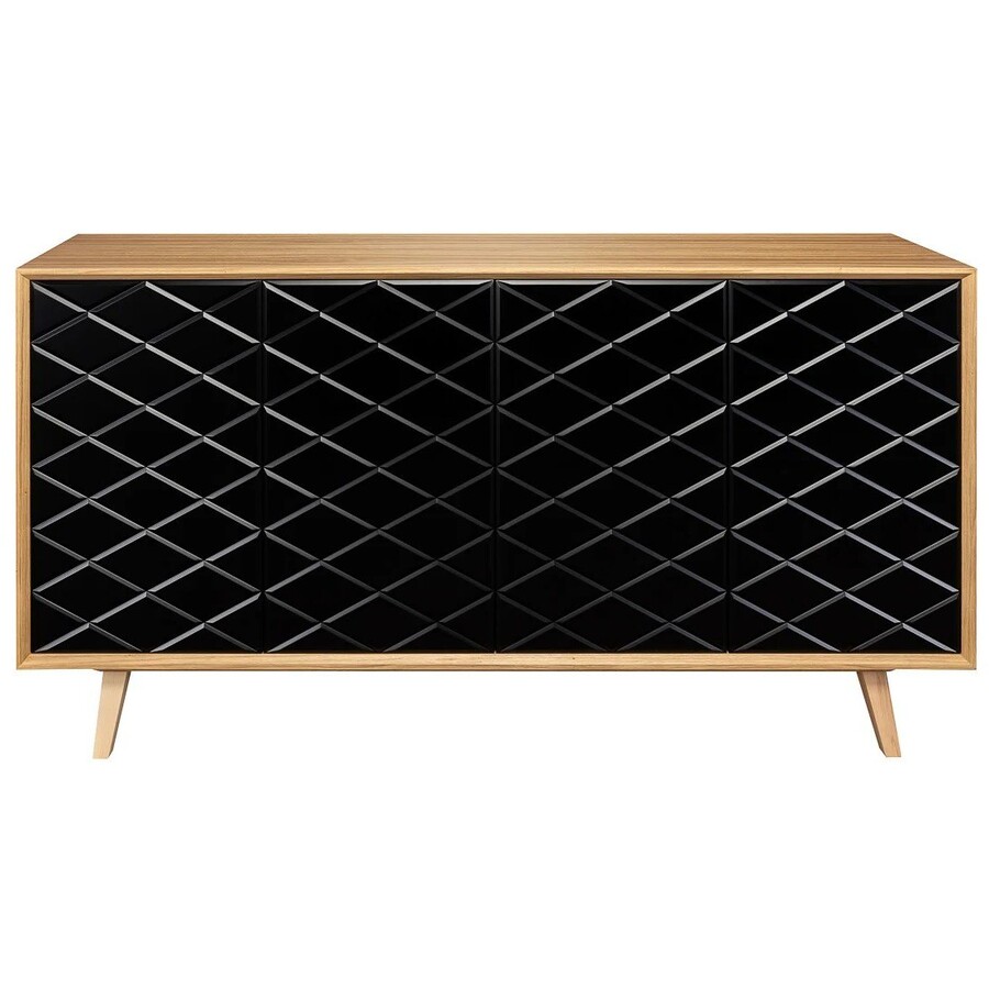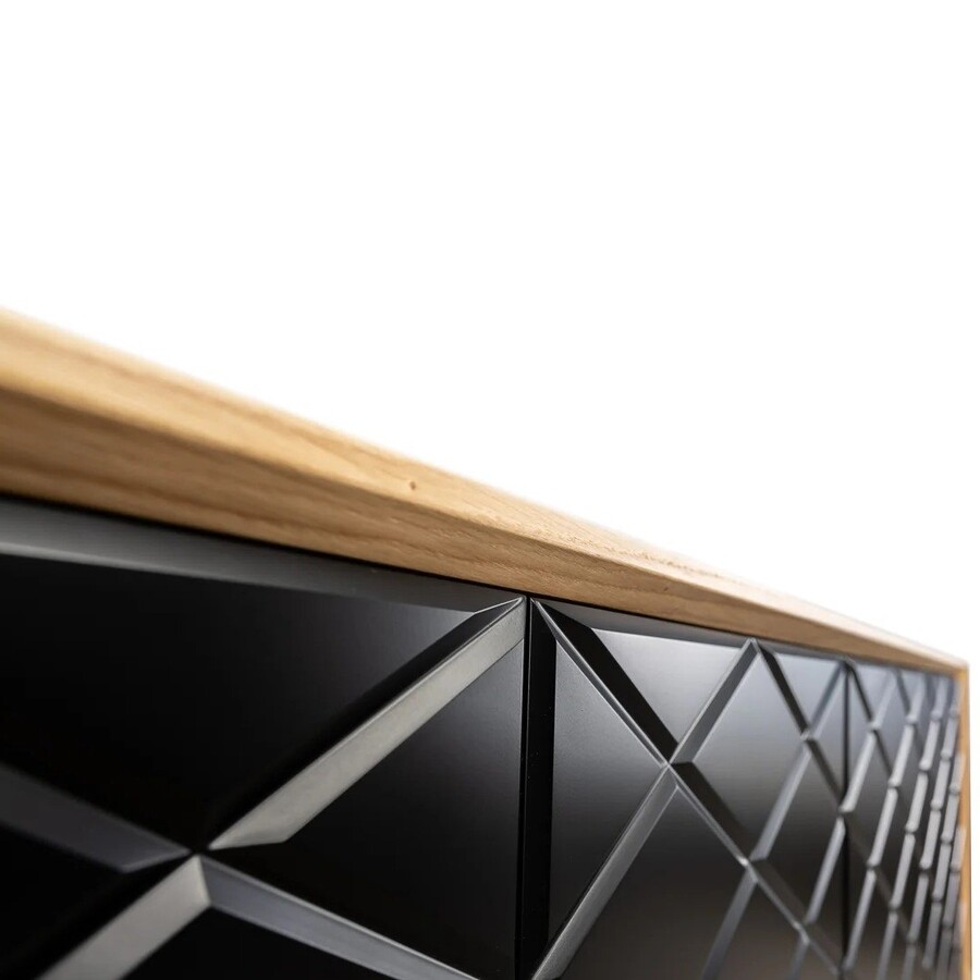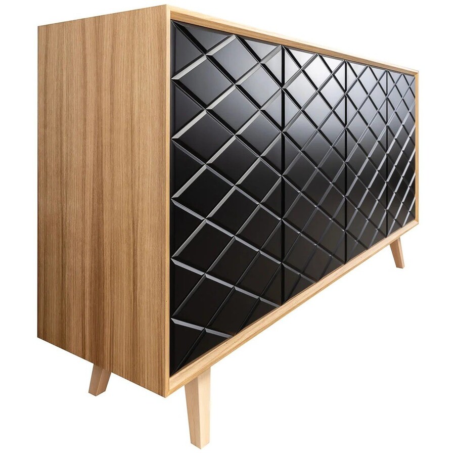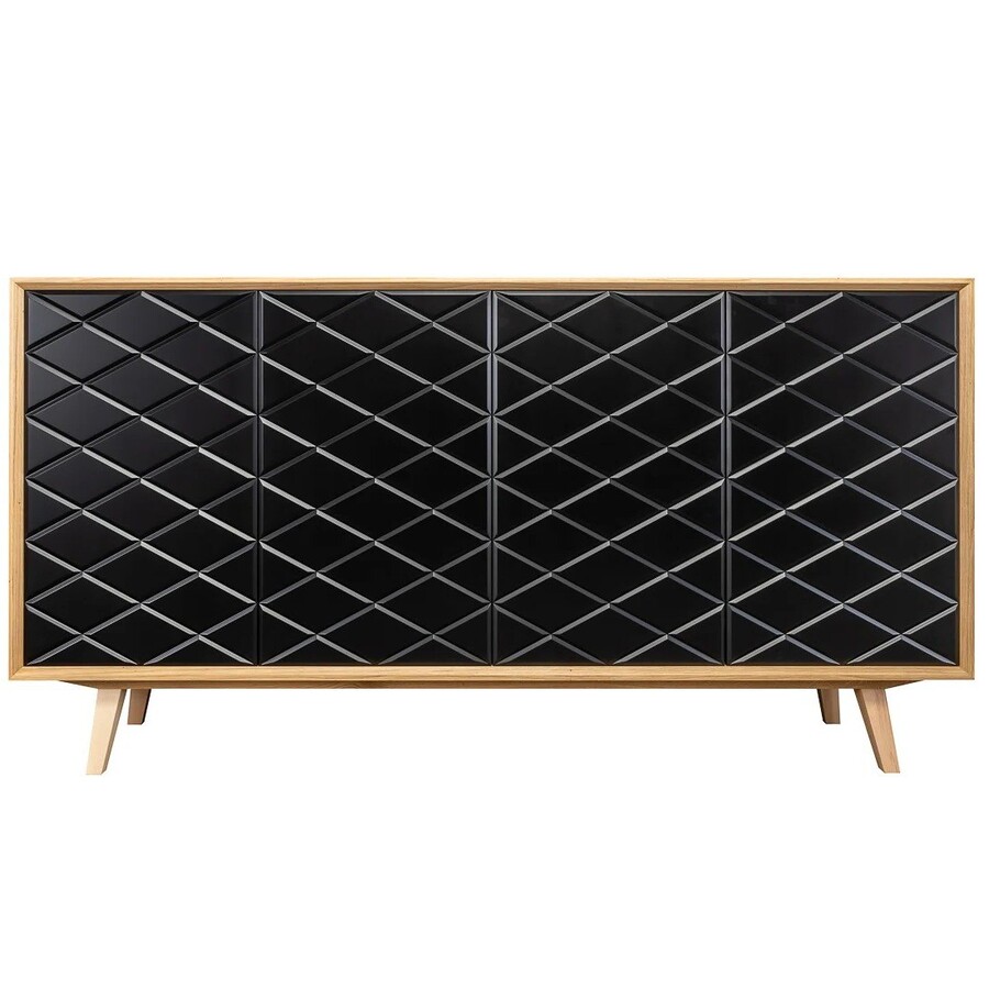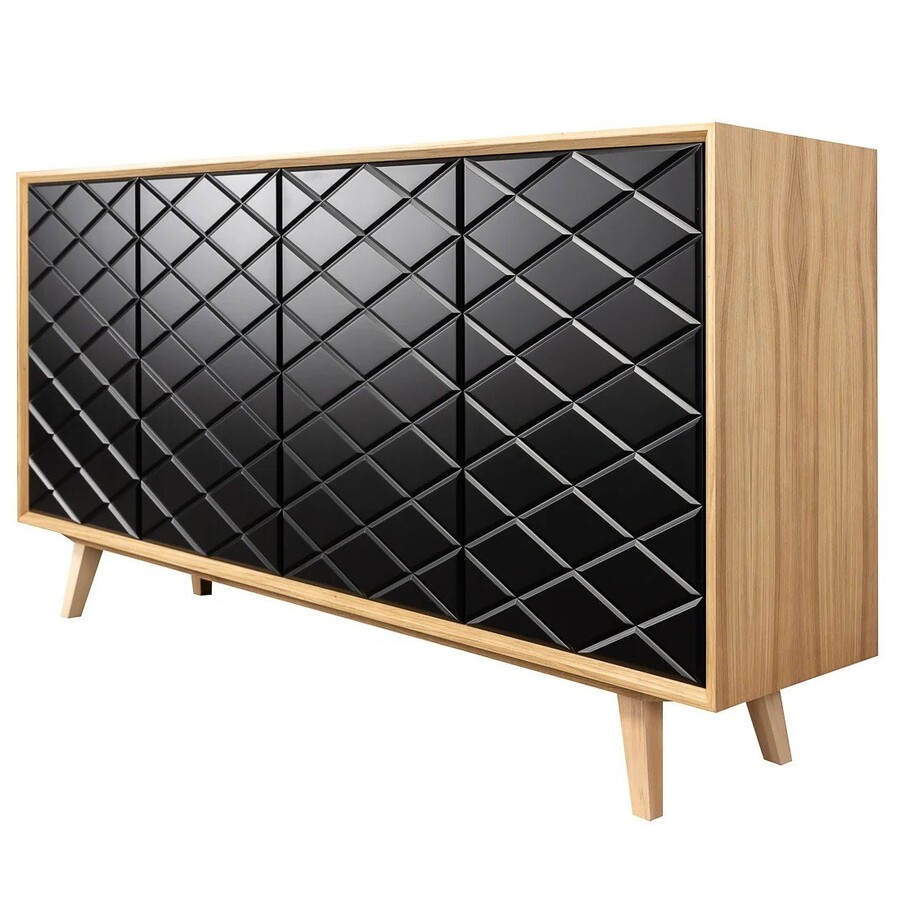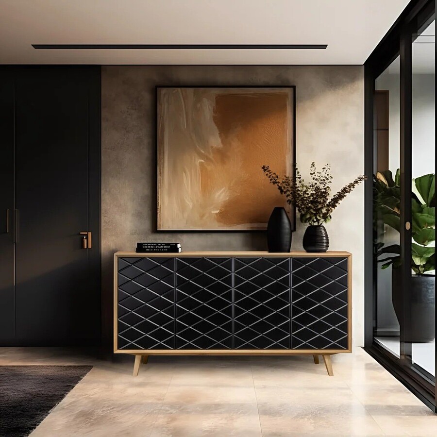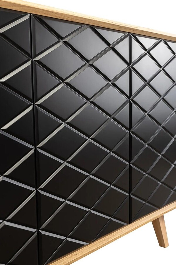 Charakterystyczny front komody Skara, pokryty geometrycznym wzorem o rombowej strukturze, natychmiast przyciąga wzrok i staje się dekoracyjnym punktem każdego wnętrza. Połączenie matowej czerni z naturalnym rysunkiem drewna tworzy kontrastową, a zarazem harmonijną całość. Dębowa rama subtelnie otacza lakierowane panele, nadając bryle lekkości i wyrafinowania. Skandynawski charakter mebla podkreślają proste, zwężane nogi, które unoszą korpus i wprowadzają do wnętrza wizualną lekkość.