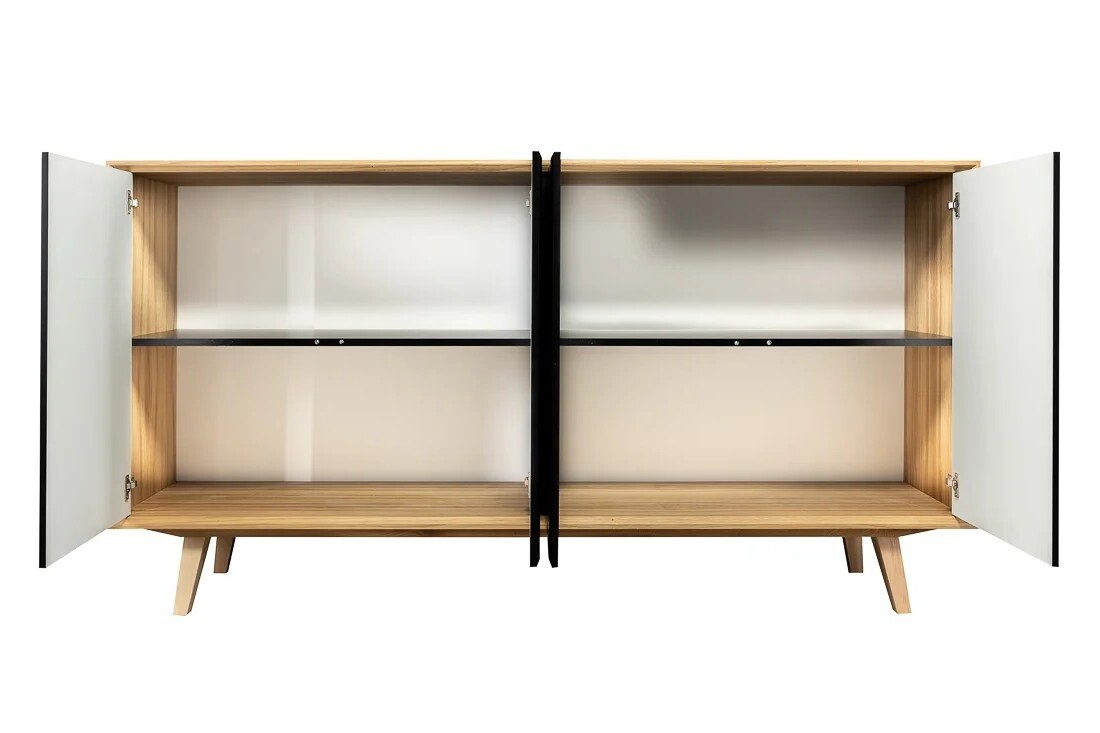 Komoda wykonana została z materiałów zapewniających trwałość i estetykę na długie lata. Korpus pokryty naturalnym fornirem dębowym doskonale komponuje się z lakierowanymi frontami z płyty MDF w głębokim, czarnym macie. Wnętrze wykonane z płyty laminowanej oferuje praktyczną przestrzeń do przechowywania, dobrze zorganizowaną i łatwą w utrzymaniu. Mechanizm push-open oparty na zawiasach Blum pozwala na wygodne otwieranie i zamykanie bez wystających uchwytów.