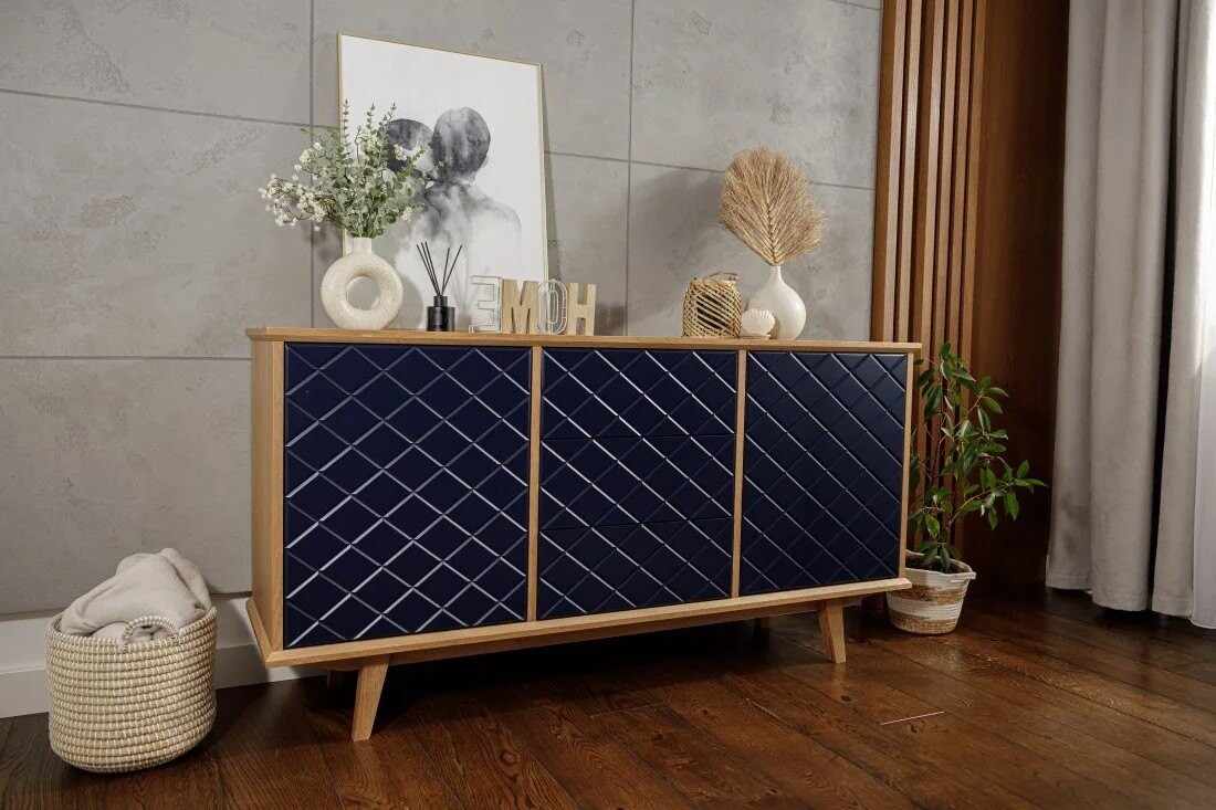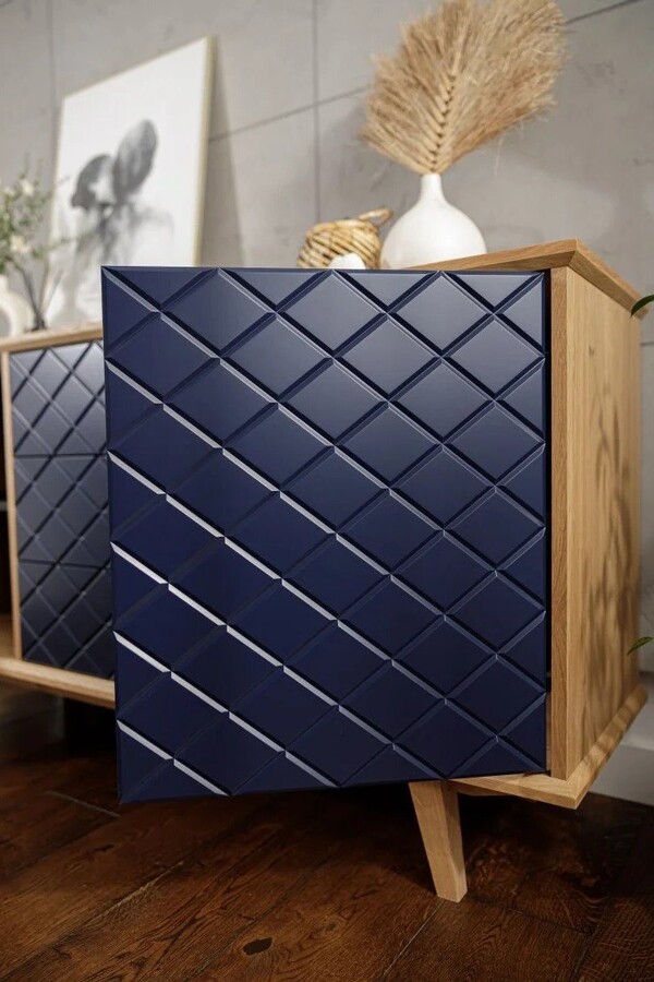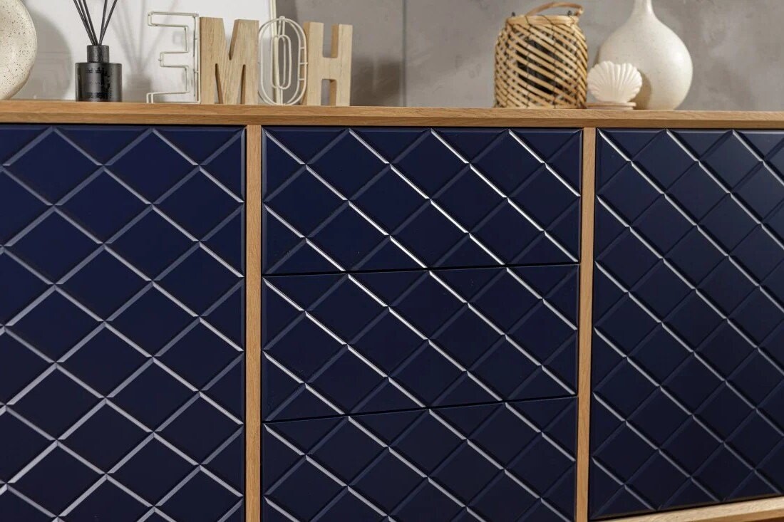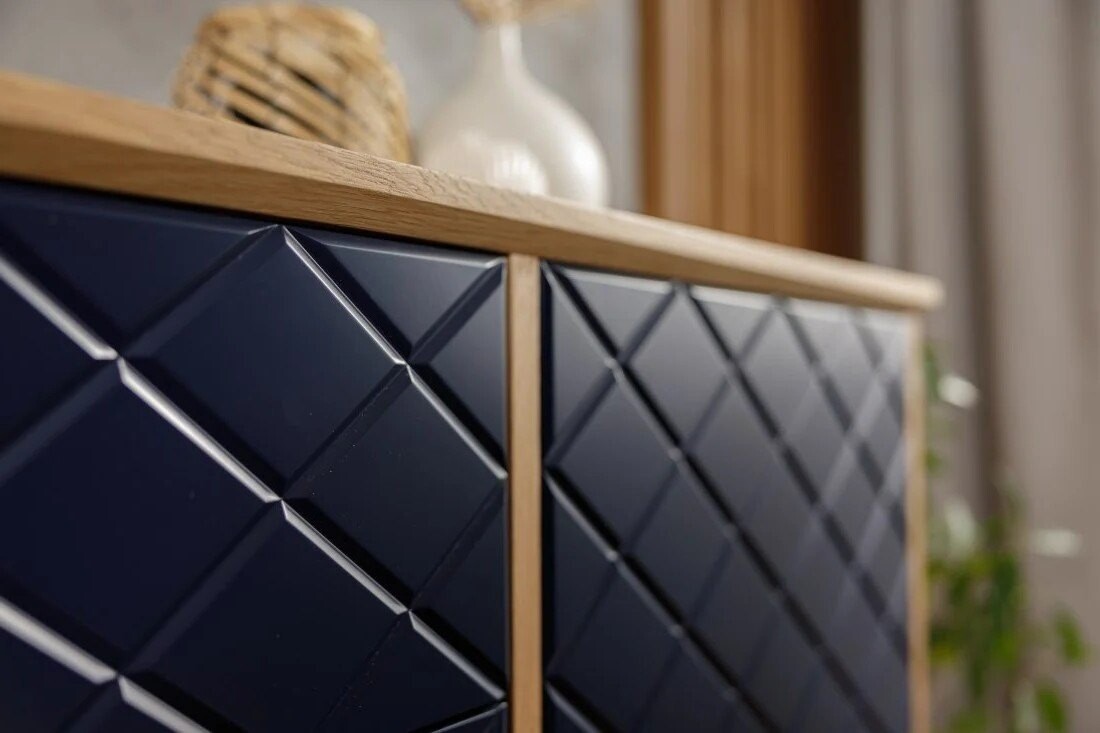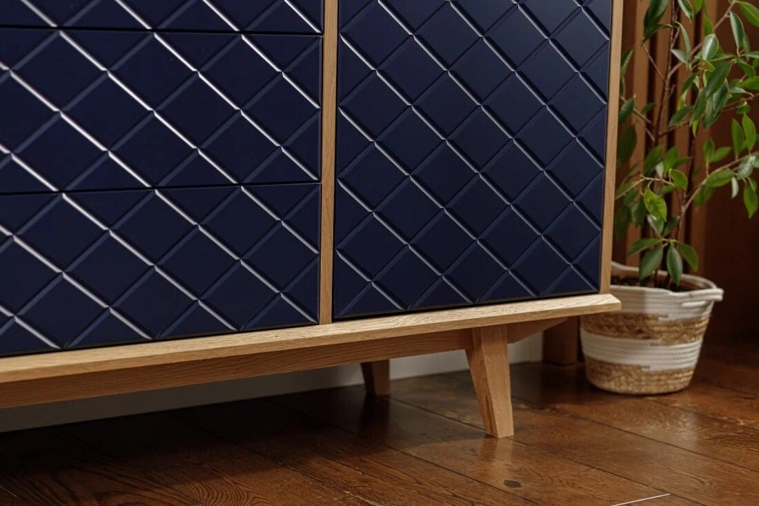 Fronty komody Enkel przyciągają wzrok dzięki unikalnej strukturze rombowych tłoczeń, które w połączeniu z matowym lakierem w odcieniu głębokiego granatu tworzą efekt wyrazistej, przestrzennej faktury. Delikatnie zaoblone krawędzie frontów i równomierne podziały szuflad podkreślają precyzję wykonania. Naturalny fornir dębowy okalający korpus stanowi elegancką ramę dla nowoczesnego wyrazu frontów, a smukłe drewniane nogi dopełniają całość lekkim, skandynawskim akcentem.