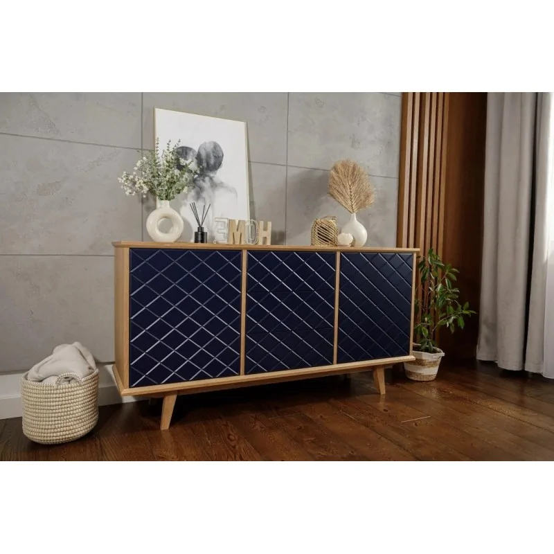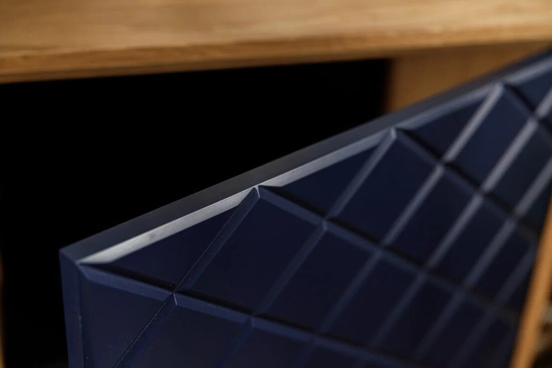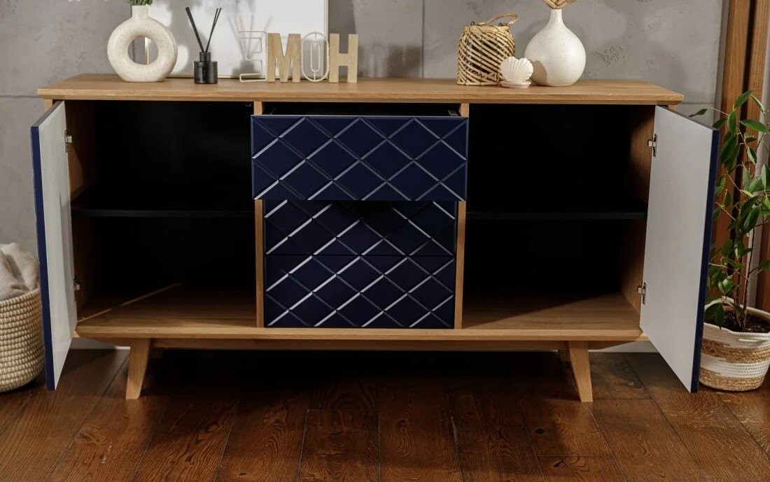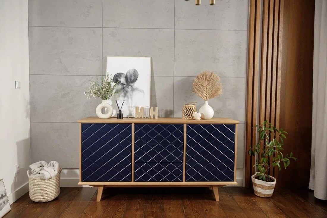 Fronty komody Enkel przyciągają wzrok dzięki unikalnej strukturze rombowych tłoczeń, które w połączeniu z matowym lakierem w odcieniu głębokiego granatu tworzą efekt wyrazistej, przestrzennej faktury. Delikatnie zaoblone krawędzie frontów i równomierne podziały szuflad podkreślają precyzję wykonania. Naturalny fornir dębowy okalający korpus stanowi elegancką ramę dla nowoczesnego wyrazu frontów, a smukłe drewniane nogi dopełniają całość lekkim, skandynawskim akcentem.