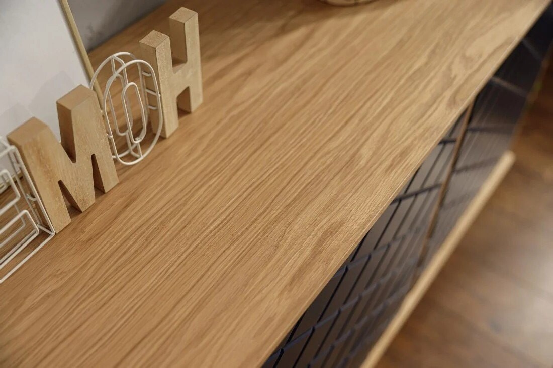 Jakość materiałów i funkcjonalność idą w parze. Fronty z lakierowanej płyty MDF nie tylko pięknie się prezentują, ale również są trwałe i odporne na codzienne użytkowanie. Korpus wykonany z fornirowanej płyty dębowej zapewnia stabilność oraz przyjemne, ciepłe wykończenie. Wnętrze mebla wykończone zostało czystą, gładką płytą laminowaną – łatwą do utrzymania w czystości. Komoda otwierana jest w systemie push-open na zawiasach Blum, co zapewnia komfort użytkowania i nowoczesną estetykę bez uchwytów.