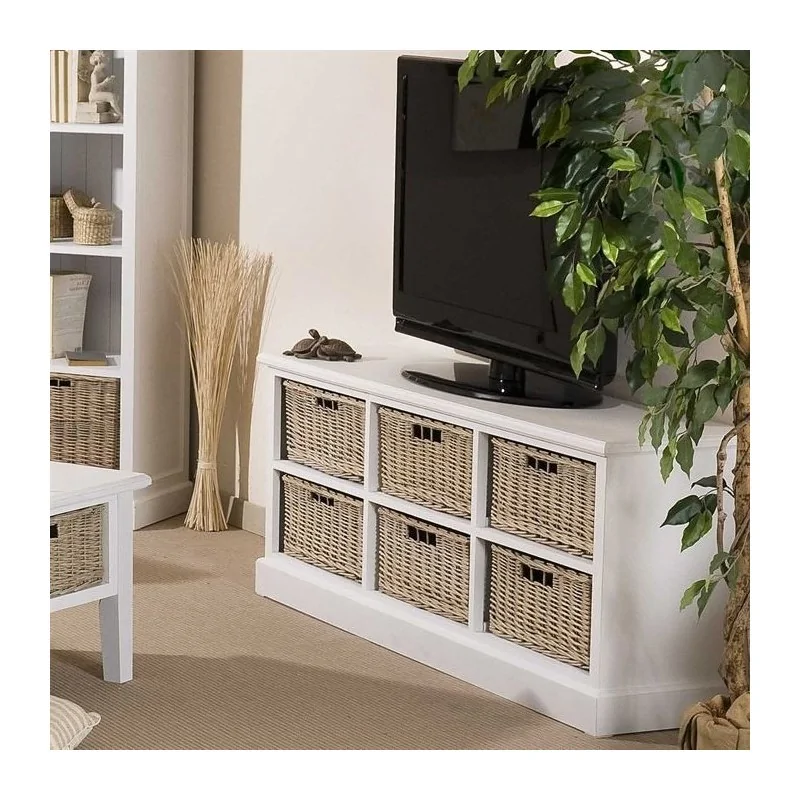 Szafka rtv drewniana Solena to mebel o wysokich walorach praktycznych, który zapewnia komfortowe miejsce na zestaw kina domowego oraz praktyczny schowek na zestaw płyt i różne akcesoria. To prosta kompozycja, jaką tworzy zasadnicza konstrukcja zewnętrzna, której wnętrze zostało podzielone na sześć jednakowych wnęk ułożonych po trzy w jednym szeregu. Ten uporządkowany układ dodatkowo wzbogaca sześć sporych, czworokątnych koszyków z wikliny zastępujących szafki i szuflady. To praktyczny schowek o dużej pojemności, pozwalający na posegregowanie i przechowanie dużej ilości przedmiotów. Szafka rtv drewniana w białym kolorze pięknie kontrastuje z ciemnym odcieniem wikliny, która jednocześnie w bardzo wyraźny sposób podkreśla typowy dla mebli rustykalnych i prowansalskich związek z naturą. Spore wymiary blatu to komfortowe miejsce nawet na duży telewizor, a dzięki wypełnieniu wnętrza koszami model zyskuje na stabilności i masywności, doskonale harmonizując z ciężkim sprzętem. Szafka rtv drewniana Solena jest pięknym stylowym dodatkiem do wnętrz w klimacie vintage, wprowadzając do nich przyjemny, ciepły nastrój.