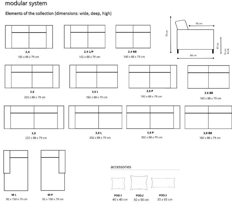 - narożnik skonstruowany jest z kilku modułów - moduły można dowolnie dobierać, by osiągnąć preferowany wymiar mebla