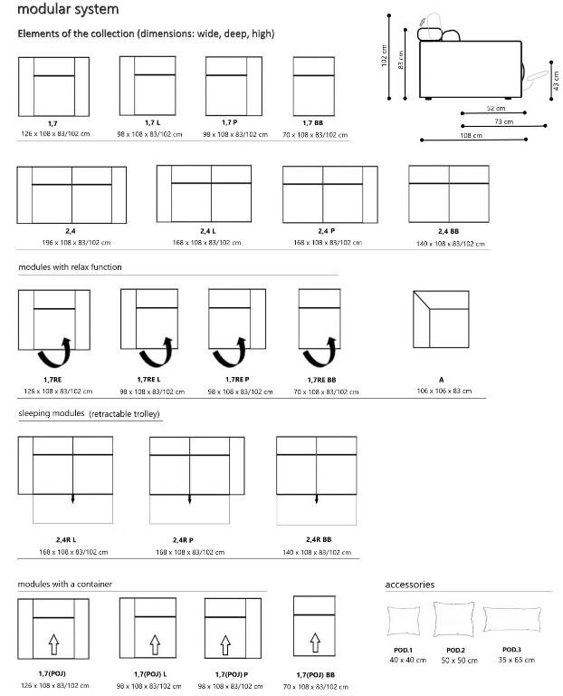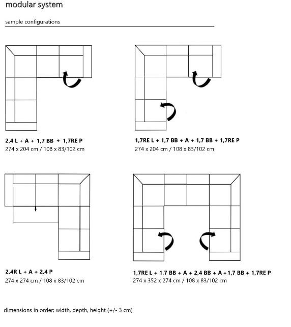 - narożnik skonstruowany jest z kilku modułów - moduły można dowolnie dobierać, by osiągnąć preferowany wymiar mebla
