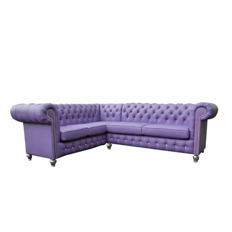 Narożnik chesterfield do salonu Deko to nie tylko piękny, ale także solidny mebel, którego konstrukcja wykonana została z drewna i płyty, a do wypełnienia siedziska użyto wysokogatunkowej pianki.