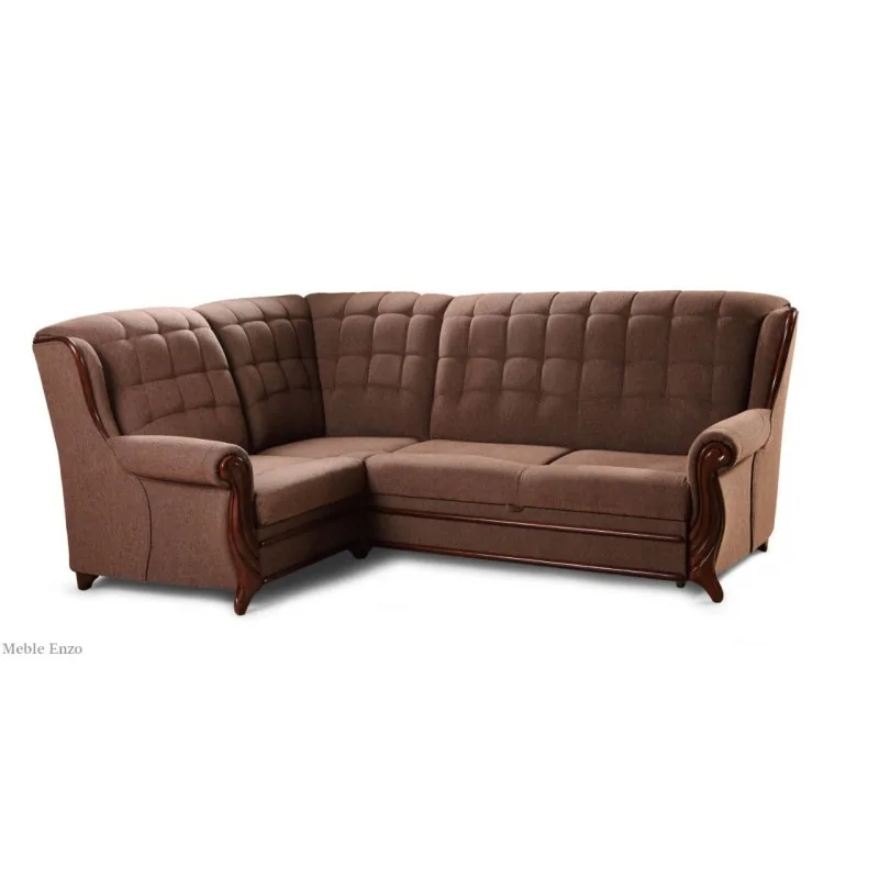 Jak lubimy odpoczywać i co właściwie uważamy za odpoczynek? Popołudnie spędzone z dziećmi, które dodają nam sił, czy może wieczór w gronie bliskich przyjaciół? A może nasze baterie ładują się podczas picia kawy? Spójrzmy na Enzo. Enzo to narożnik klasyczny z funkcją spania, który dostosuje się do rytmu wszystkich domowników i ich gości. Wokół niego będzie kręcił się nasz świat. Stanie się towarzyszem wszystkich naszych domowych czynności. Wygodny i funkcjonalny, będzie sercem. Warto również zwrócić uwagę na jego nieszablonowe walory estetyczne i designerskie. Dopasuje się do wszystkich wnętrz, niezależnie od dominującego w nich stylu. Możemy zostawić go w proponowanym kolorze albo wybrać odpowiednią dla siebie tkaninę tapicerską. Mocne pikowania to jego znak szczególny. Pikowania te są ozdobą. Zwróćmy uwagę również na drewniane elementy z przedniej części. Wyprofilowane, własnoręcznie rzeźbione, ucieszą wzrok miłośników detali. To właśnie takie zabiegi estetyczne bogacą nie tylko narożnik, ale i całą przestrzeń, nadając jej bogatego, chociaż w dalszym ciągu rodzinnego wyrazu.