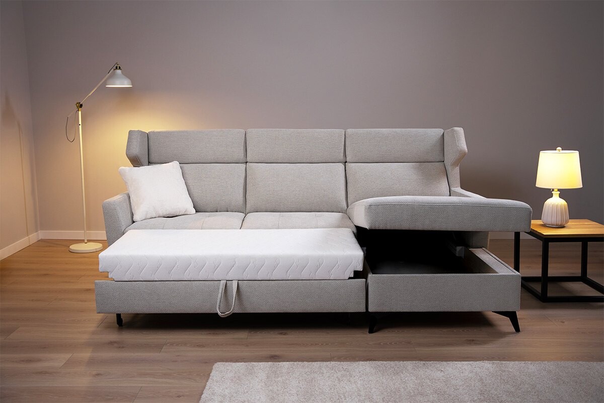 Narożnik Ramzes wyposażony jest w funkcję spania z systemem rozkładania typu delfin, co umożliwia szybkie i łatwe przekształcenie go w wygodne łóżko. Pojemnik na pościel zapewnia dodatkowe miejsce do przechowywania, co jest praktycznym rozwiązaniem w codziennym użytkowaniu. Narożnik może być wykonany w układzie lewym lub prawym, a także istnieje możliwość dostosowania wymiarów do indywidualnych potrzeb, co czyni go wszechstronnym meblem. Na życzenie klienta możliwe jest wysłanie bezpłatnych próbek wybranych tkanin obiciowych.
