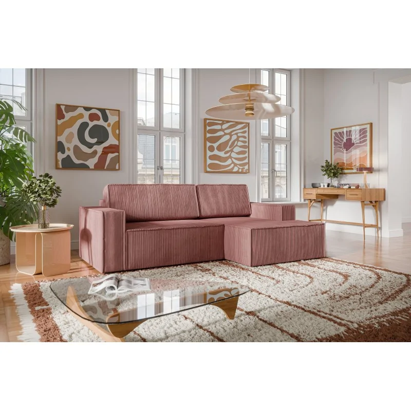 Narożnik prezentuje się w efektownej koralowej tapicerce sztruksowej z charakterystycznym prążkowanym wzorem, który nadaje mu wyjątkowy charakter i głębię faktury. Bryła mebla utrzymana jest w minimalistycznej formie z prostymi, geometrycznymi liniami i niskimi podłokietnikami. Miękkie poduszki siedziskowe i oparciowe tworzą harmonijną całość, zapewniając maksymalny komfort użytkowania.