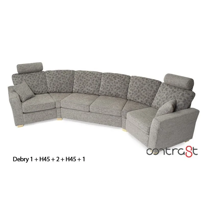 Zaprezentowany w ofercie narożnik Derby 2 to propozycja konkretnego układu modułów, tworzącego kompozycję dedykowana specjalnym dużym wnętrzom, w których organizuje się centralną strefę wypoczynkową. Lekko wyokrąglony kształt przypominający formę łuku najlepiej zaprezentuje się w swobodnym ustawieniu, z dala od ścian i narożników pokoju. Mebel jest tylko jedną z wielu propozycji, które można aranżować samodzielnie wybierając układ najbardziej pasujący do wnętrza. Z drugiej strony najważniejszą zaletą takiej kompozycji jest opcja tworzenia zarówno niewielkich kanap do pokoi w blokach, jak i bardzo przestronnych narożników do loftów i wielkich salonów. Poza opcją modułowego zestawiania mebla jego wyjątkowym walorem jest konstrukcja oparta na prostych elementach i umieszczona na przypominających płaskie klocki drewnianych nogach. Ta prostota i brak masywnych, rozbudowanych elementów sprawia, że nawet bardzo duży mebel zachowuje cechy delikatności, lekkości i wdzięku. Narożnik Derby 2 jest też doskonałym materiałem do komponowania ciekawego, niestandardowego designu za pomoc łączenia różnych kolorów i wzorów tkanin. Liczne poduszki oparcia, dodatkowe zagłówki i małe jaśki zapewniają wygodę i efektywny, przyjemny wypoczynek.