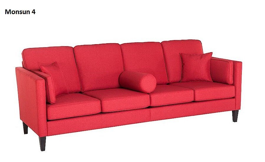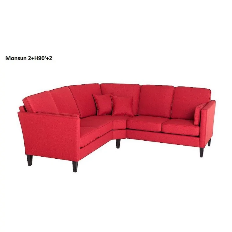 Narożnik skandynawski Monsun został zaprojektowany zgodnie z zasadami wzornictwa skandynawskiego, w jego prostej, pozbawionej ozdób i wykwintności formie. Pomimo tych ograniczeń zdobniczych mebel jest wyjątkowo atrakcyjny i zgrabny, a składająca się z dwóch ulokowanych symetrycznie ramion kompozycja bardziej sprawia wrażenie przyjemnej kanapki towarzyskiej niż ciężkiego, masywnego mebla salonowego. O delikatności i wyjątkowej harmonii modelu decyduje zarówno jego ogólna bryła, jak i staranne wykończenia poszczególnych elementów. Na lekkość wizualną narożnika z pewnością składa się też ulokowanie go na wysokich drewnianych nóżkach, oraz wyposażenie w cienkie podłokietniki. Narożnik skandynawski Monsun przyciąga uwagę wyjątkową harmonią kompozycyjną. Takie wrażenie wywiera szczególnie staranne wykończenie poduszek oparcia i siedziska, z których każda została obramowana wałeczkiem na wszystkich krawędziach. Wałeczki nie tylko nadają im regularny kształt, ale też usztywniają, dzięki czemu poduszki wydają się być niemal idealne. Dopełnieniem całości są dwa małe jaśki i dwie prostokątne poduszeczki uzupełniające podłokietniki. Czerwona tapicerka pięknie harmonizuje z czarnymi nogami, jednak mebel można też zamówić w innej stylizacji, w pastelowych kolorach, a nawet w skórzanej tapicerce.