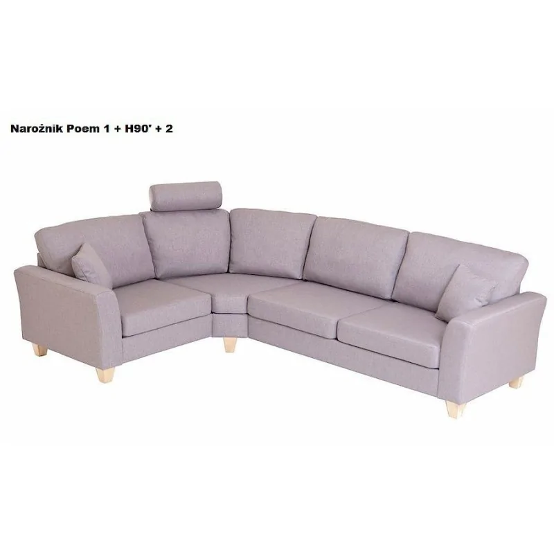 Narożnik Poem to doskonały wybór do strefy wypoczynkowej w dużym salonie, z przeznaczeniem do narożnika lub ulokowania w centralnej części pomieszczenia. Model nie posiada funkcji spania, dlatego może być dowolnie komponowany nawet z ciężkimi stolikami i ławami oraz dodatkową pufą lub fotelem. Zaprezentowany mebel ma konstrukcję modułową, w tym wypadku zaprojektowaną w formie asymetrycznej z wyokrągloną strefą narożną. Takie rozwiązanie pozwala na wygodne zajęcie miejsca także w tym module. Całość jest idealnie przystosowania do potrzeb wspólnych spotkań rodzinnych czy towarzyskich, w których wszyscy goście znajdują się w tej samej strefie. Design narożnika opiera się na prostej formie, a delikatnym urozmaiceniem schematycznych kształtów są wyokrąglone i lekko wyprofilowane podłokietniki. Wnętrze mebla wyposażono w szereg poduszek siedziska i oparcia, dzięki czemu tworzą atrakcyjną, urozmaiconą kompozycję. Dopełnieniem designu są niewysokie nóżki, dodające meblowi lekkości pomimo jego sporych rozmiarów. W siedzisku zastosowano sprężyny faliste i elastyczną piankę, gwarantujące wysoki komfort i odporność na wygniatanie. W komplecie znalazły się też dwa małe, dekoracyjne jaski. Mebel modułowy można też komponować w wielu innych układach.