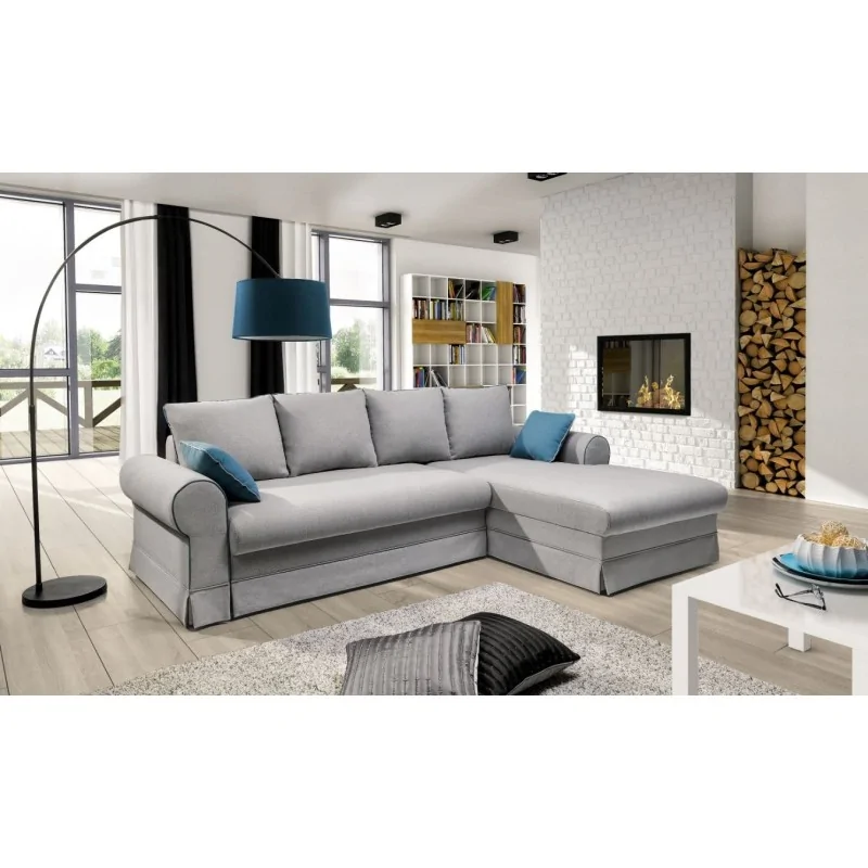 Narożnik Dante to przestronny stylizowany mebel, który doskonale sprawdzi się, jako element wyposażenia strefy wypoczynkowej w salonie, jak i spełni funkcję miejsca do spania. Model wyposażony jest w opcję rozkładania oraz pojemnik na pościel, dzięki czemu będzie doskonałym rozwiązaniem w mniejszych mieszkaniach bloków, w których salon i sypialnia znajdują się w jednym pomieszczeniu. W designie mebla zwracają uwagę klasyczne, wyokrąglone podłokietniki, których szerokie powierzchnie sprzyjają wypoczynkowi w pozycji półleżącej, a także pozwalają na wygodne oparcie się. Wysunięta do przodu część bocznego skrzydła narożnika nie posiada oparcia umożliwiając siadanie z każdej strony. To rozwiązanie sprzyja ustawieniu mebla z dala od ścian, w centralnej części pomieszczenia. Masywnej sylwetce łagodności dodają mocno wyokrąglone przody poduszek siedziska, a także oparcie składające się z czterech samodzielnych poduch i dwóch dekoracyjnych jaśków. Narożnik Dante to wygodny i funkcjonalny mebel do tradycyjnych wnętrz.