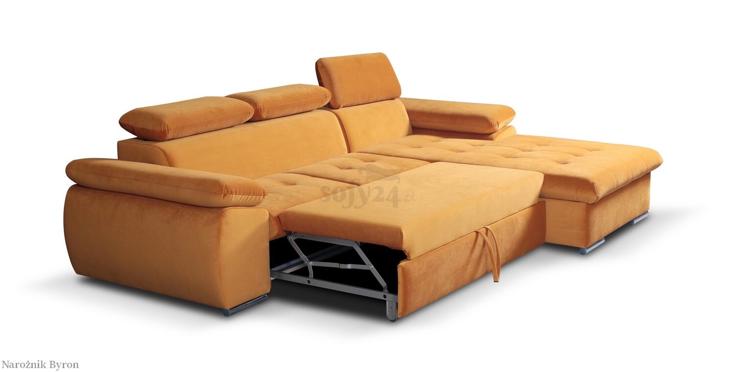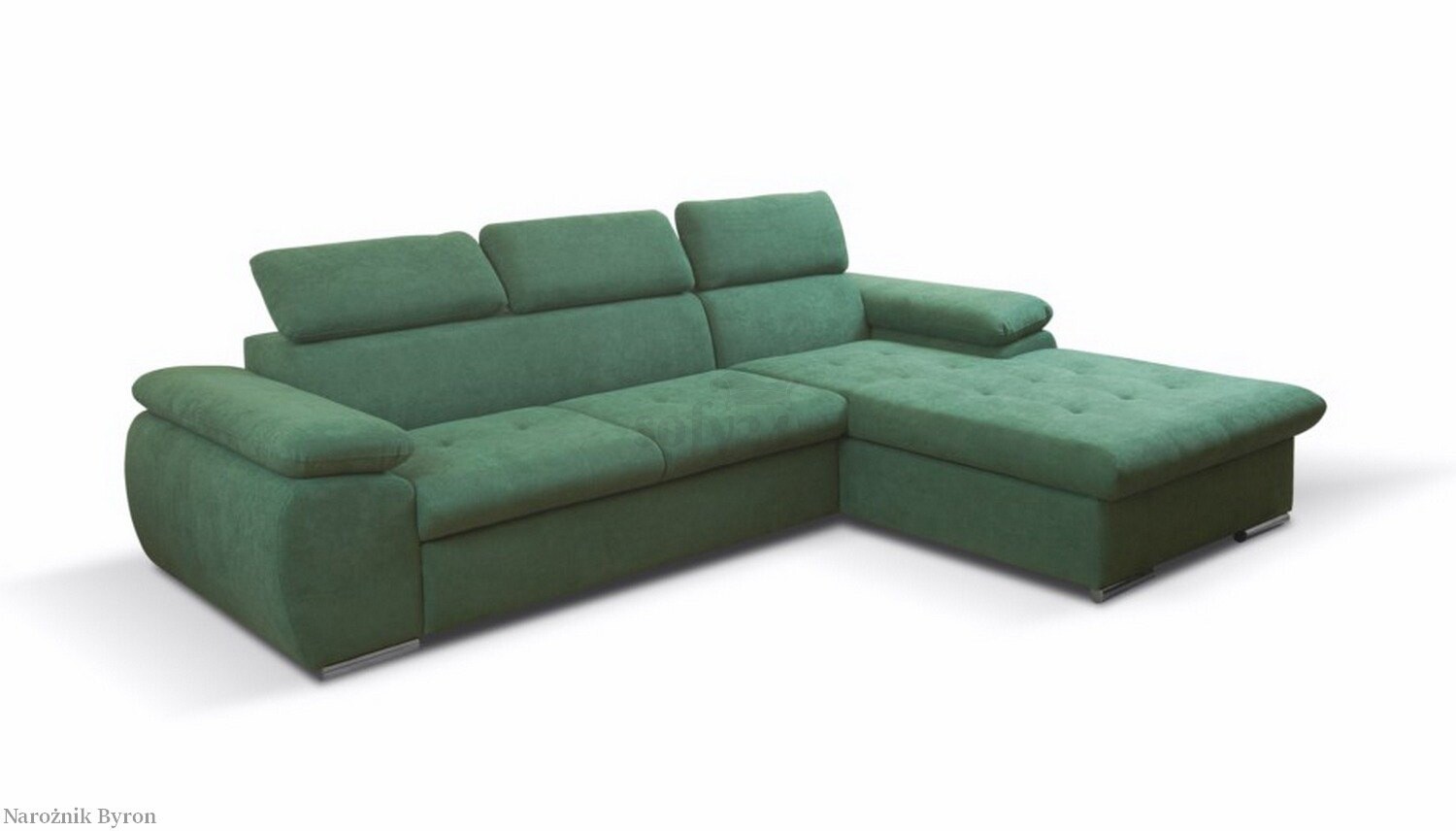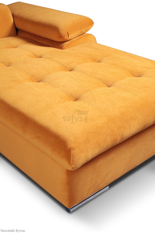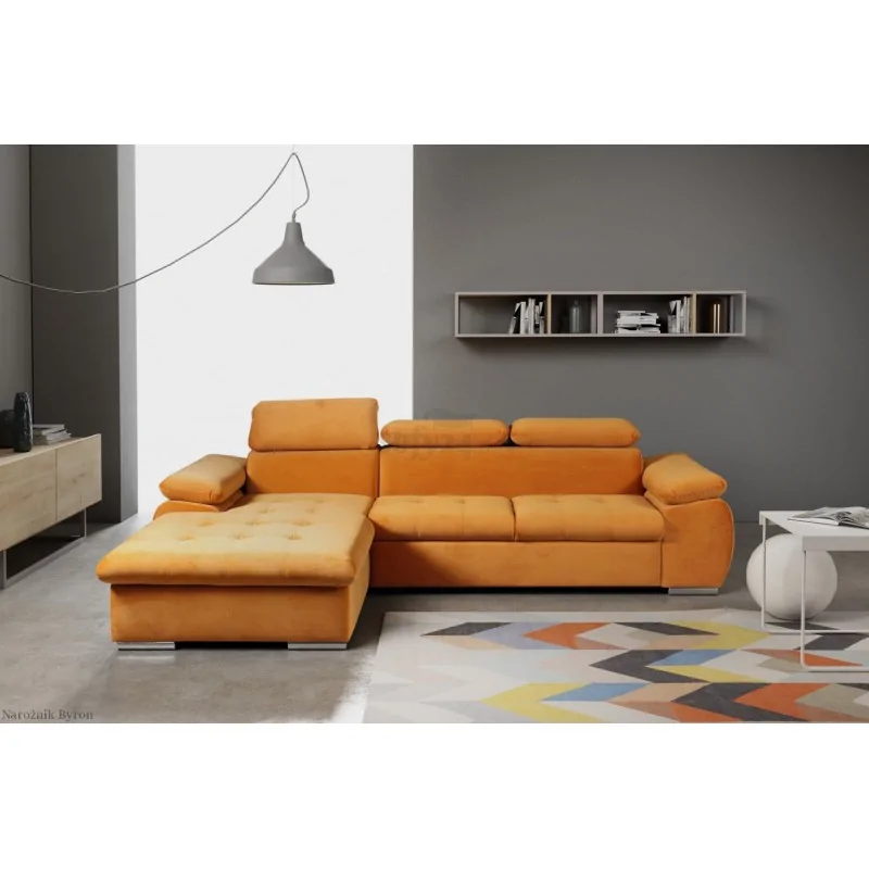 Narożnik Byron to model, który przypadnie do gustu miłośnikom nowoczesnych rozwiązań. Będzie pasował do wielu stylów aranżacyjnych, w tym skandynawskiego. Jego designerski wygląd sprawi, że salon zyska nie tylko miękki i wygodny mebel wypoczynkowy, ale również element dekoracyjny, który podwyższy standard i upiększy przestrzeń. Pod względem wizualnym jest nieszablonowy. Klasyczna podstawa a nad nią miękkie siedzisko ozdobione delikatnymi pikowaniami. Wyżej gładkie oparcie z zagłówkami, co jest innowacyjnym pomysłem gwarantującym komfortowe podtrzymanie szyi i głowy. Dużym atutem tego nowoczesnego narożnika są podłokietniki, które przypominają swoim wyglądem miękkie poduchy. Funkcja spania Byrona zachwyci miłośników urządzania kameralnych przyjęć w rodzinnym gronie. Możemy zaproponować gościom nocleg i w jednej chwili przygotować dla nich wygodne posłanie, a dzięki pojemnikowi, nie będziemy tracić czasu na szukanie pościeli. Konstrukcja zaprojektowana tak, że nawet podczas długiego użytkowania, domownicy unikną wgnieceń.