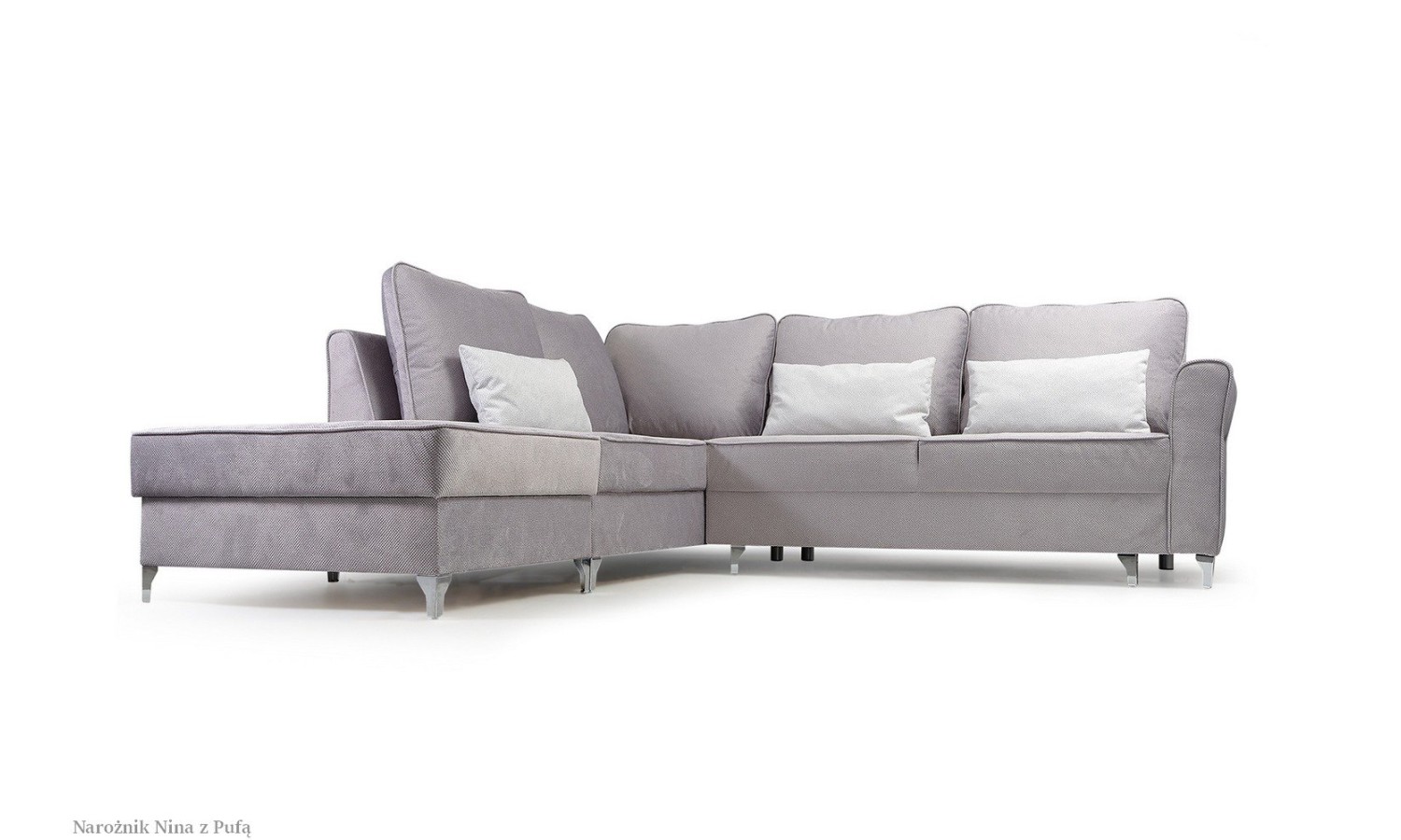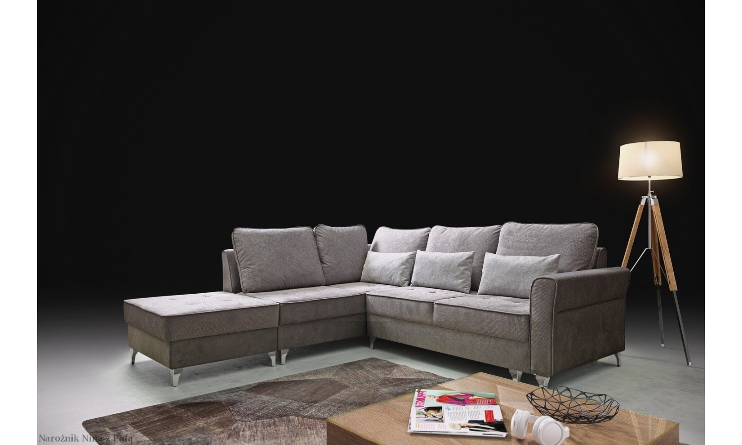 Narożnik, który odpowiada na wszystkie potrzeby domowników? Poznajmy stylową Ninę. Przyjrzyjmy się jej z bliska. Dość prosta, proporcjonalna sylwetka wprowadzi spokój i harmonię do każdego wnętrza. Poduchy na oparciu sprawią, że przestrzeń stanie się niesamowicie przytulna, bezpieczna. Minimalistyczne nogi zapewniają stabilność. To szczególnie ważne, kiedy lubimy zapraszać bliskich lub spędzamy czas z rodziną. Czym jeszcze zaskoczy nas ten narożnik? Pufą. Pufa jest mobilna, więc możemy postawić ją w każdym miejscu – dosunąć do narożnika, lub uczynić, w zależności od sytuacji, osobnym siedziskiem. Funkcja spania również jest nieoceniona. W każdej chwili możemy zaproponować gościom, aby zostali na noc. Wymiary sofy wpasują się idealnie do dużych, jak i standardowych salonów. Szeroki wybór tkanin obicia pozwala uzyskać bardzo spersonalizowany charakter.