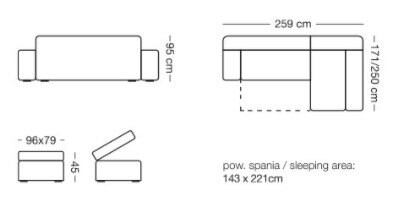↪ Do narożnika jest dołączona pufa ( pufa z pojemnikiem ), wymiar narożnika bez pufy wynosi 259 x 171 cm