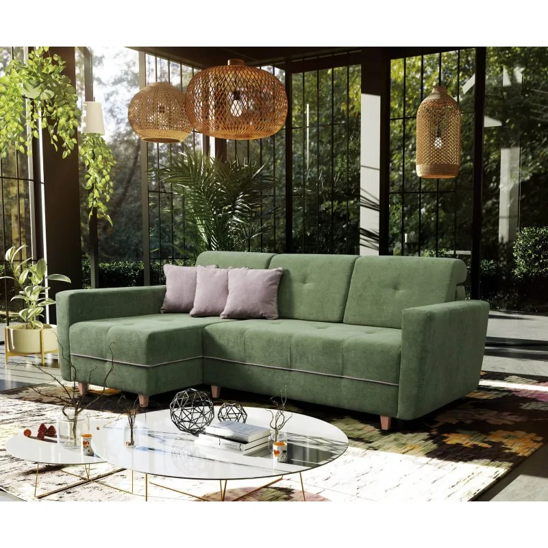Wygodny narożnik to podstawa każdego salonu. To właśnie na nim będziemy mogli odpocząć, zdrzemnąć się lub obejrzeć film. Narożniki dzięki swojej formie są rodzinne i sprzyjają wspólnemu spędzaniu czasu. Haris to narożnik, który pokochamy od pierwszego wejrzenia. Śmiała sylwetka, która wygląda na bardzo miękką, w rzeczywistości właśnie taka jest. Spójrzmy, jak pięknie wygląda w zielonej kolorystyce i komponuje się ze wszystkimi stylami aranżacyjnymi, które podkreślają ważność natury. Możemy również postawić na inny kolor, który pasuje do naszego gustu. Haris wydobędzie piękno z całego salonu, a także wyodrębni kolory ścian, ozdoby, inne meble. Reprezentatywny, komfortowy i czarujący, stanie się dla pokoju dziennego najbogatszą wizytówką, a dla domowników – synonimem błogiego odpoczynku. Docenimy go również za bezkonkurencyjną jakość i solidność.
