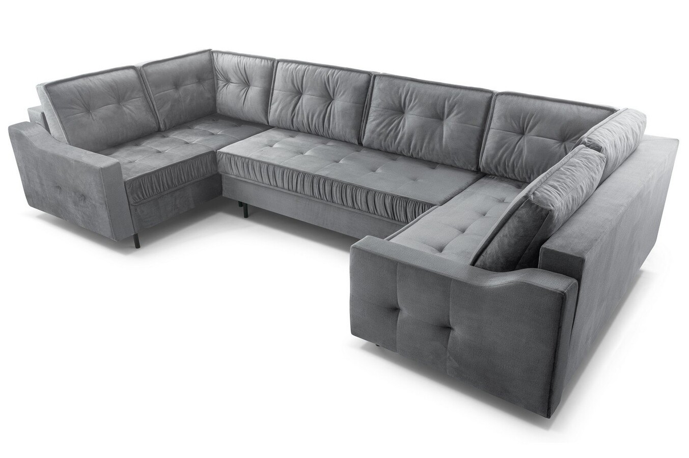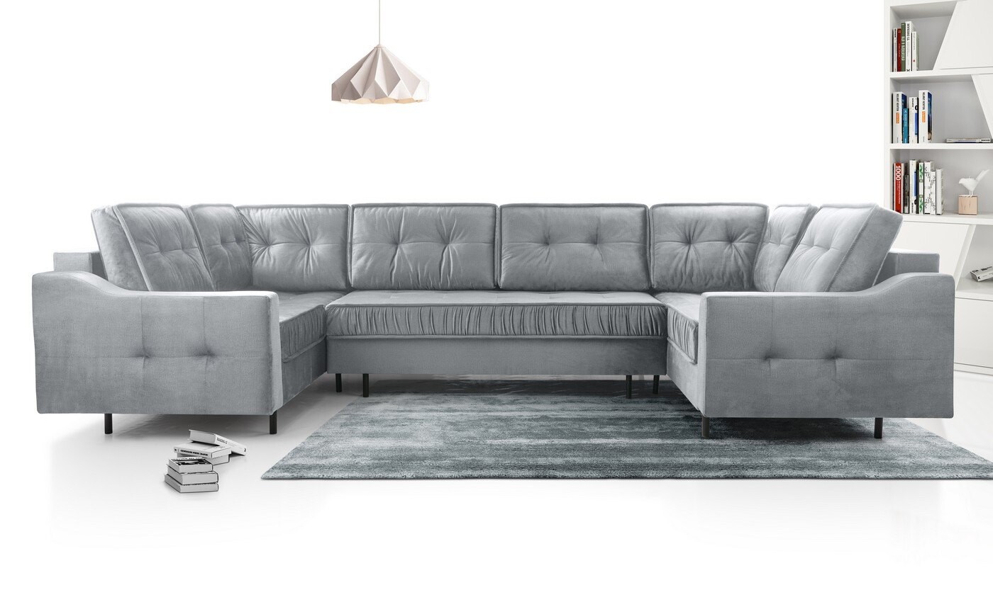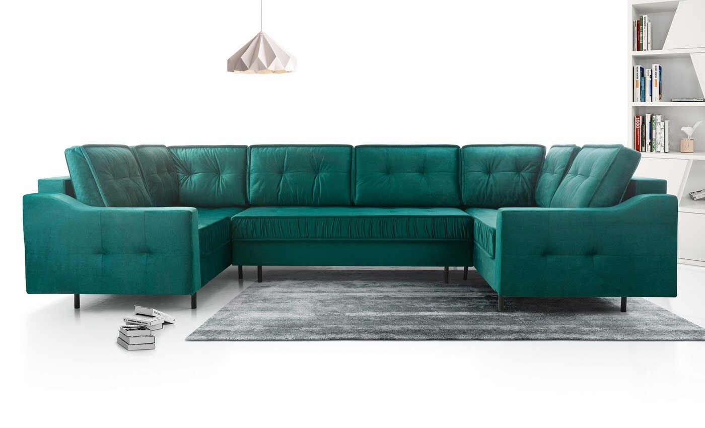 Duży metraż salonu powinien być uczczony pokaźnym, reprezentatywnym meblem wypoczynkowym. Domownicy, dla których ważna jest bliskość, dobre relacje i chwile spędzone w gronie inspirujących osób, powinni wybrać narożnik w kształcie litery U. Ta konstrukcja mebla pozwala na utrzymanie kontaktu wzrokowego z rozmówcami, a także sprzyja poczuciu przytulności. Kandydatem na stanowisko dopasowanego, odpowiadającego na potrzeby właścicieli mebla jest narożnik Hubert U. Zaznaczy swoją obecność dzięki doskonałemu charakterowi. Stylowe pikowania przeplatają się przez większą powierzchnię bryły. Taki zabieg sprawił, że mebel ten zyskał na elegancji i pięknie. I pomimo tego, że Hubert to mebel o bardzo pokaźnych kształtach i wymiarach, to dzięki metalowym nogom, które go unoszą, wydaje się niezwykle lekki i nieprzytłaczający. Warto wiedzieć, że ten narożnik posiada funkcję spania, więc podzieli się dużą powierzchnią do snu. Nie zabrakło mu również pojemników.