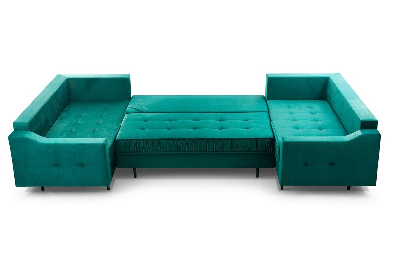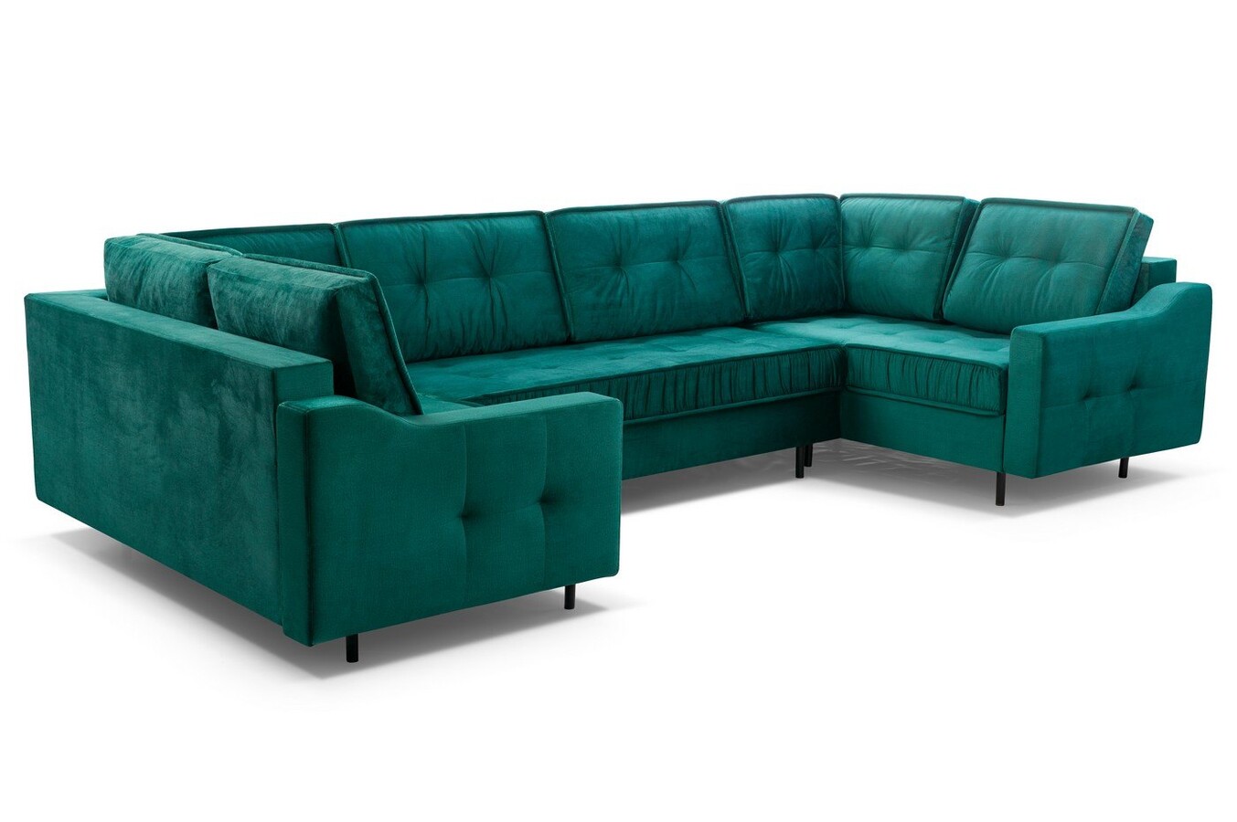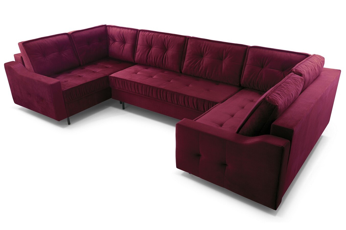 Duży metraż salonu powinien być uczczony pokaźnym, reprezentatywnym meblem wypoczynkowym. Domownicy, dla których ważna jest bliskość, dobre relacje i chwile spędzone w gronie inspirujących osób, powinni wybrać narożnik w kształcie litery U. Ta konstrukcja mebla pozwala na utrzymanie kontaktu wzrokowego z rozmówcami, a także sprzyja poczuciu przytulności. Kandydatem na stanowisko dopasowanego, odpowiadającego na potrzeby właścicieli mebla jest narożnik Hubert U. Zaznaczy swoją obecność dzięki doskonałemu charakterowi. Stylowe pikowania przeplatają się przez większą powierzchnię bryły. Taki zabieg sprawił, że mebel ten zyskał na elegancji i pięknie. I pomimo tego, że Hubert to mebel o bardzo pokaźnych kształtach i wymiarach, to dzięki metalowym nogom, które go unoszą, wydaje się niezwykle lekki i nieprzytłaczający. Warto wiedzieć, że ten narożnik posiada funkcję spania, więc podzieli się dużą powierzchnią do snu. Nie zabrakło mu również pojemników.