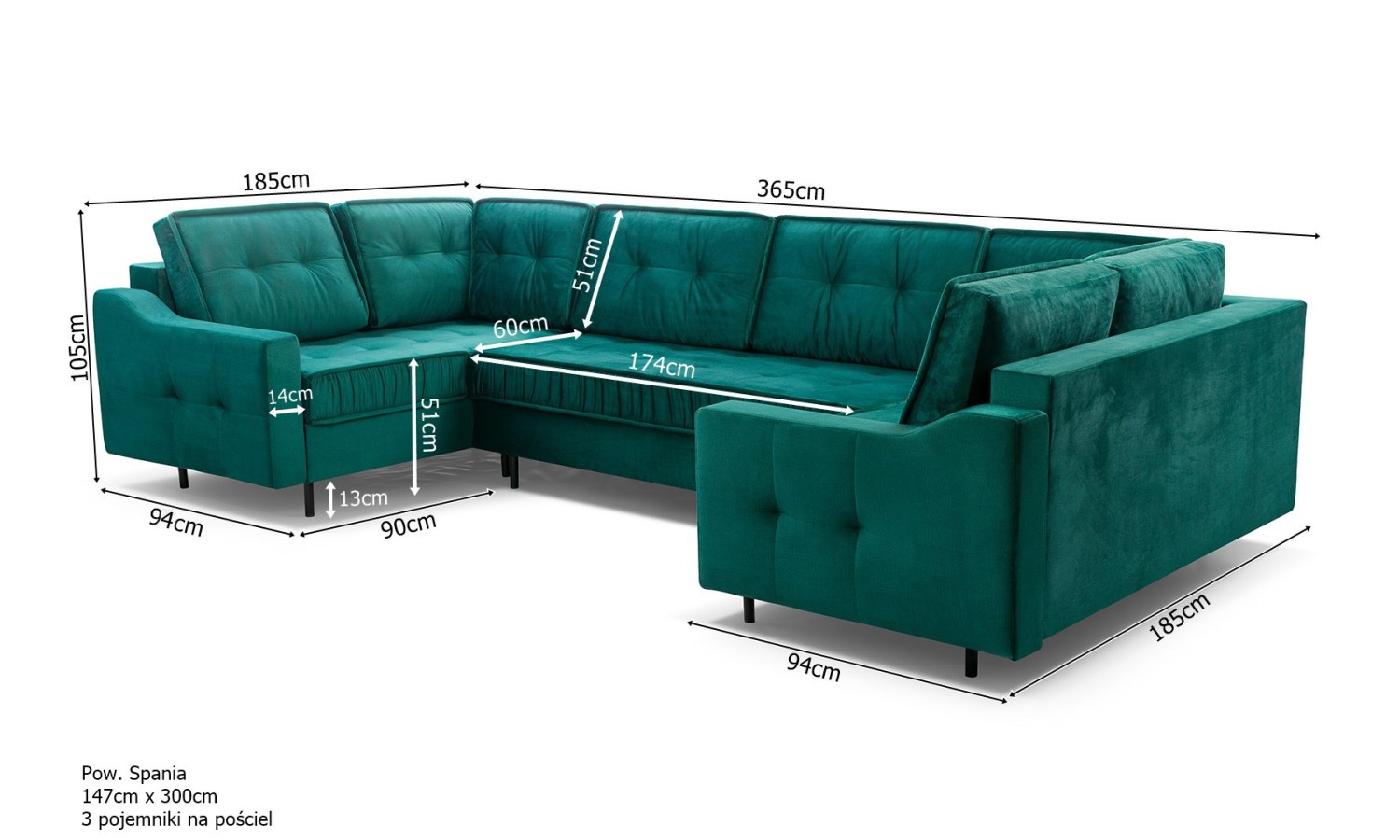 Narożnik Hubert U 185 x 365 x 185 cm z funkcją spania oraz 3 pojemnikami