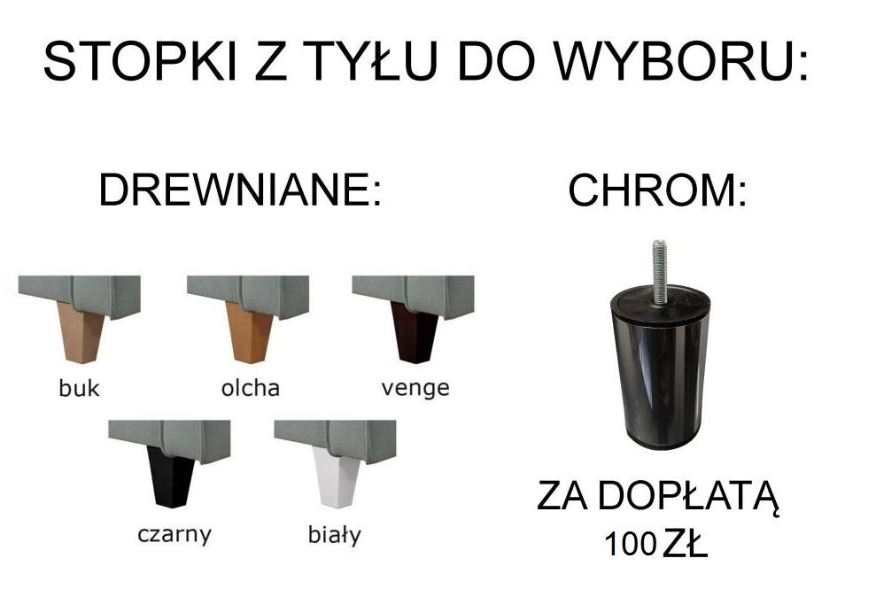- Nóżki z przodu: metalowe, chromowane lub czarne. Nóżki z tyłu: drewniane lub metalowe (metalowe za dopłatą + 100 zł)
