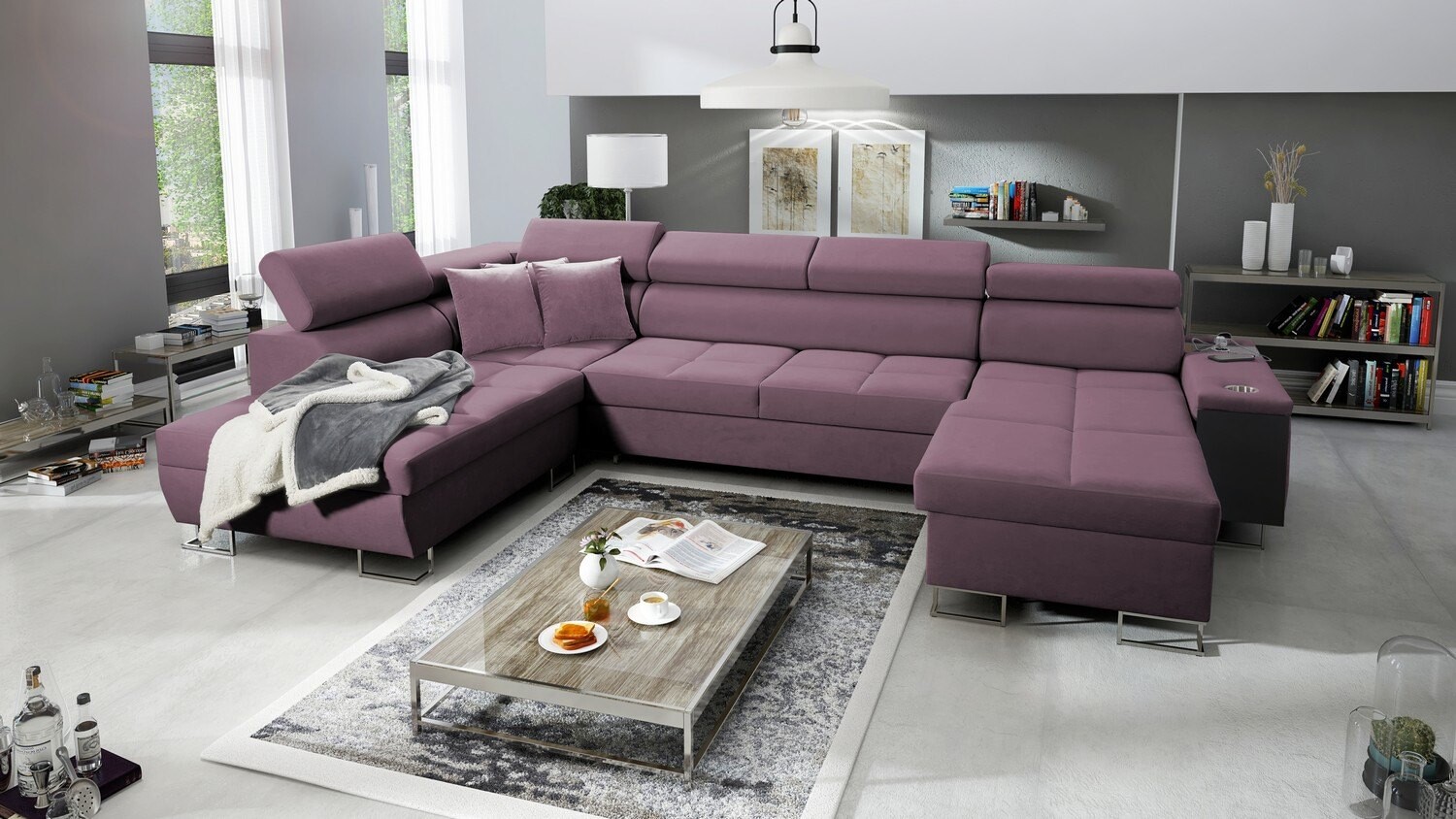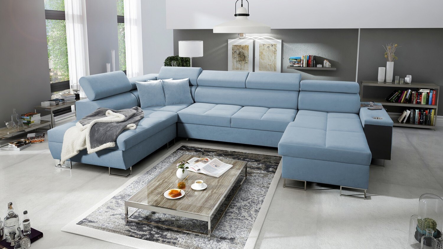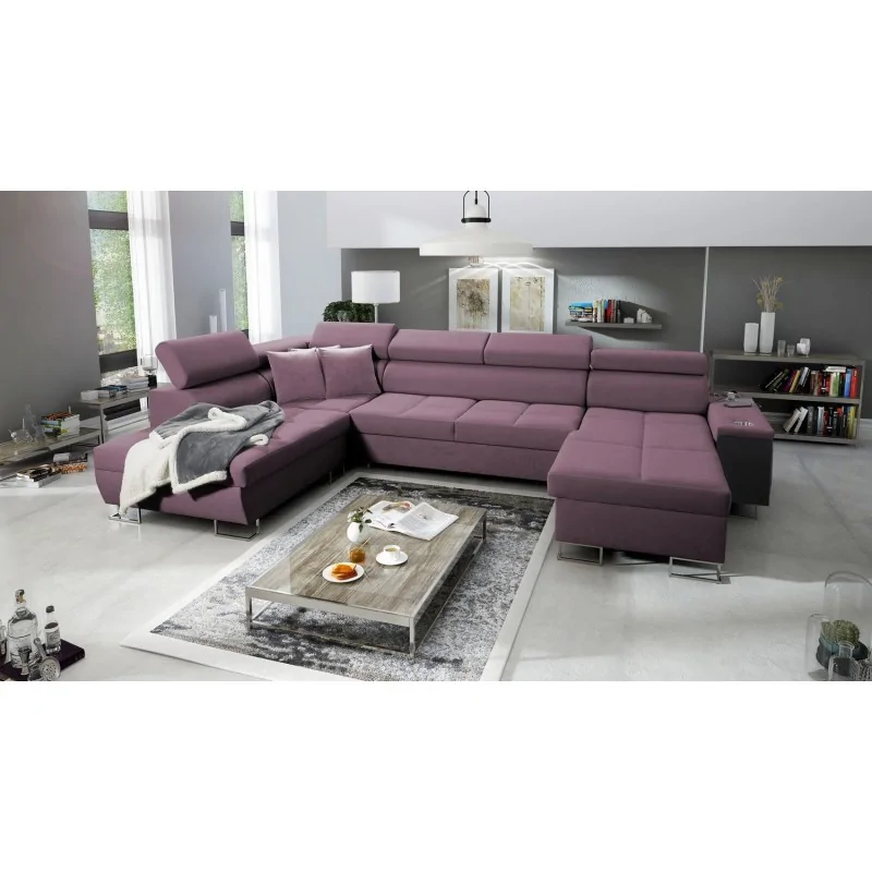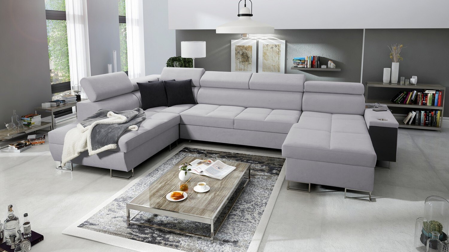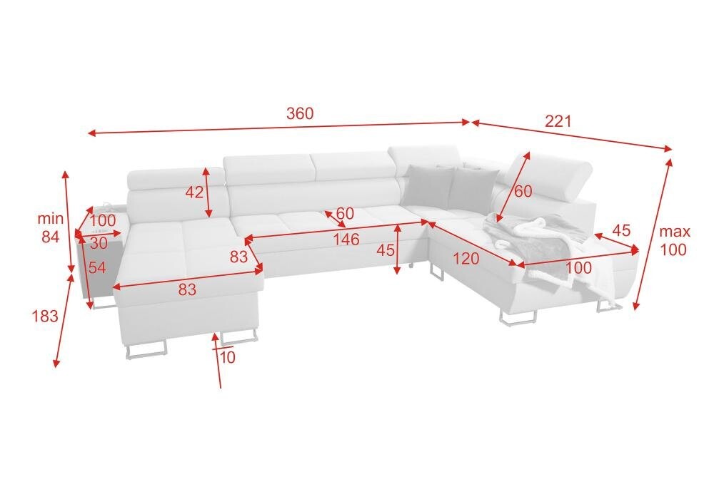 Narożnik Temida VI 183x360x221 cm - z barkiem i innymi funkcjonalnymi dodatkami wniesie do salonu powiew nowoczesności. Ten przestronny mebel zapewnia mnóstwo przestrzeni do wygodnego odpoczynku na szerokim siedzisku, wyposażonym w oparcia z regulowanymi zagłówkami. Czytanie książek, relaks z ulubionym drinkiem czy popołudniowa drzemka – wszystkie te czynności stają się prawdziwą przyjemnością, gdy do dyspozycji mamy ten model obszernej kanapy narożnej z kolekcji Temida.