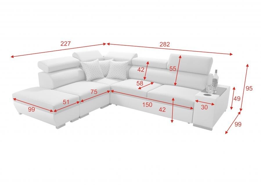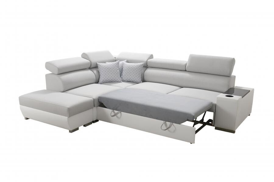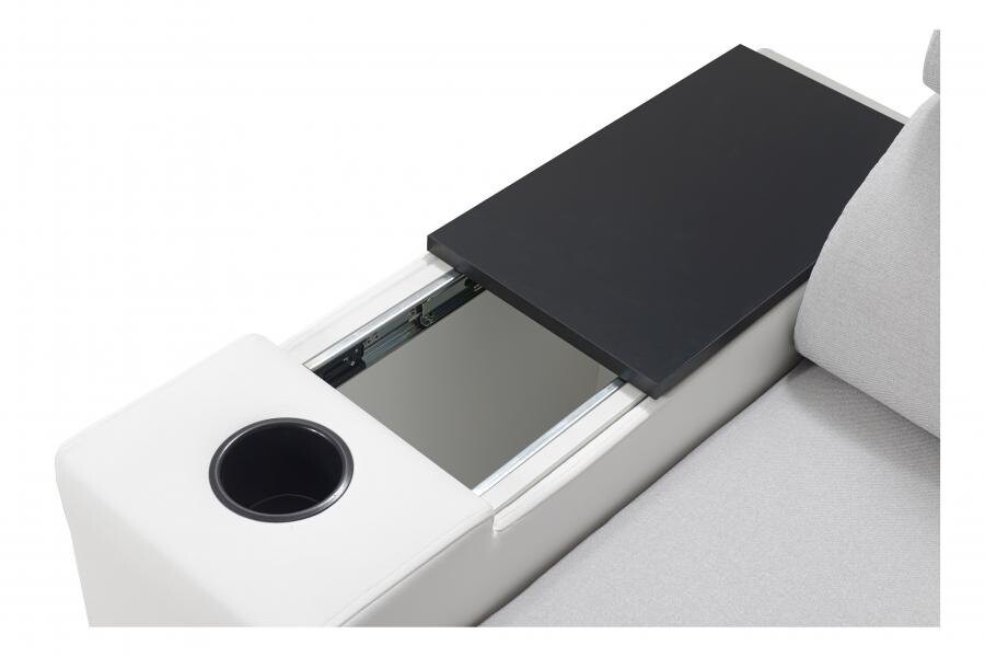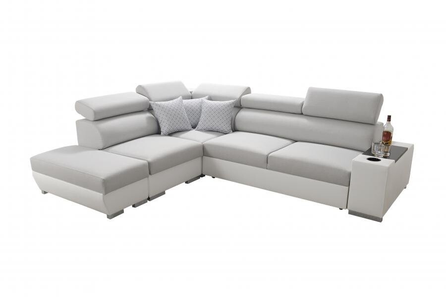 Rozkładany Narożnikz barkiem Kery VII 282x227 cm został także wyposażony w elegancką i przydatną półkę, otwierany barek i kubek pod napoje, do wyboru w kolorze srebrnym lub czarnym. Dzięki temu każdy, kto marzy o relaksie w miłej atmosferze, będzie mógł na nimkomfortowo odpocząć. Oferujemy możliwość spersonalizowania prezentowanego tutaj narożnika, a także do wyboru wiele pozostałych modeli z kolekcji Kery.
