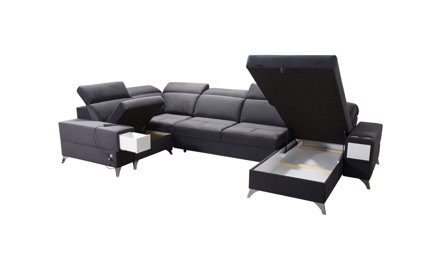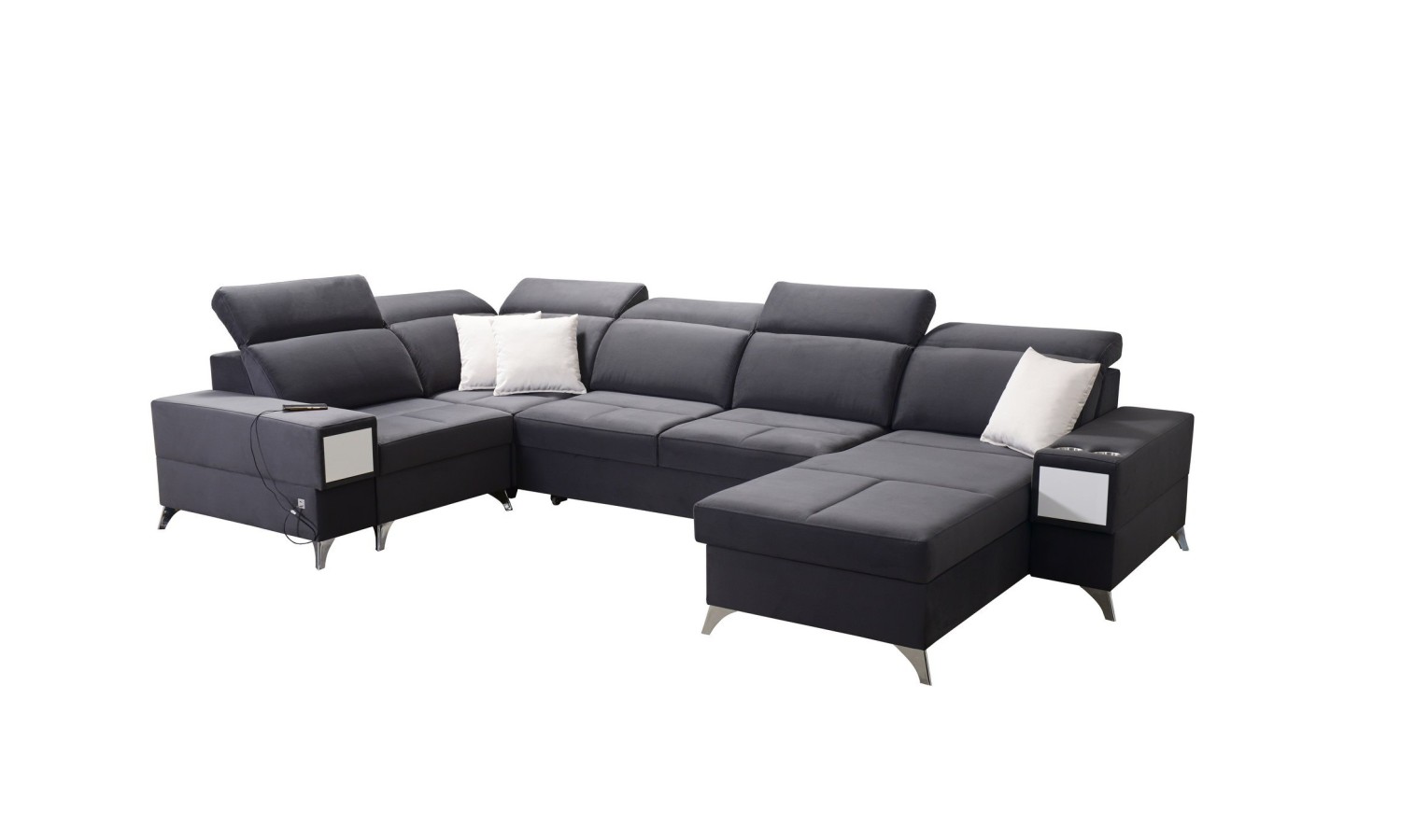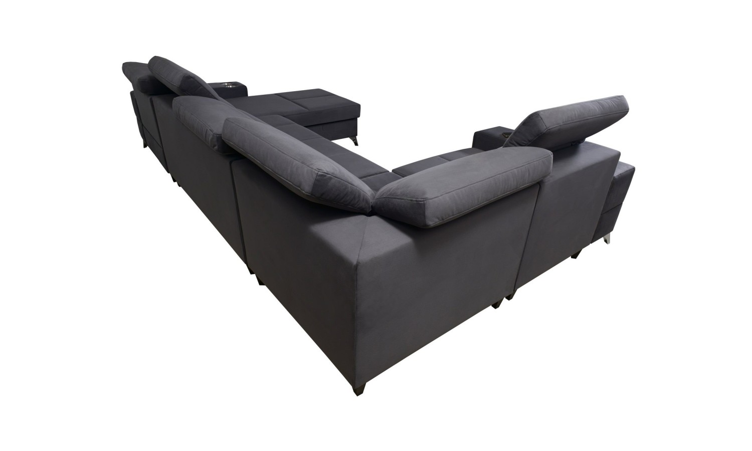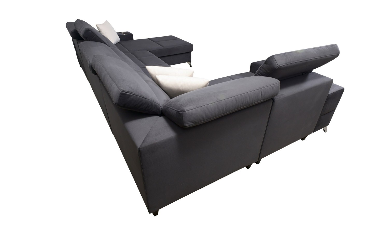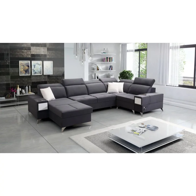 Narożnik Bahama IV wyróżnia się unikalnym kształtem litery U, co pozwala na optymalne wykorzystanie przestrzeni w salonie. Jego duże wymiary sprawiają, że jest idealnym wyborem dla dużych rodzin lub osób, które często przyjmują gości. Wykonany z miękkiej, ale trwałej tkaniny, oferuje komfortowe miejsce do relaksu. Funkcja rozkładania pozwala na łatwe przekształcenie narożnika w przestronne łóżko, a wbudowane schowki zapewniają dodatkowe miejsce na przechowywanie pościeli.