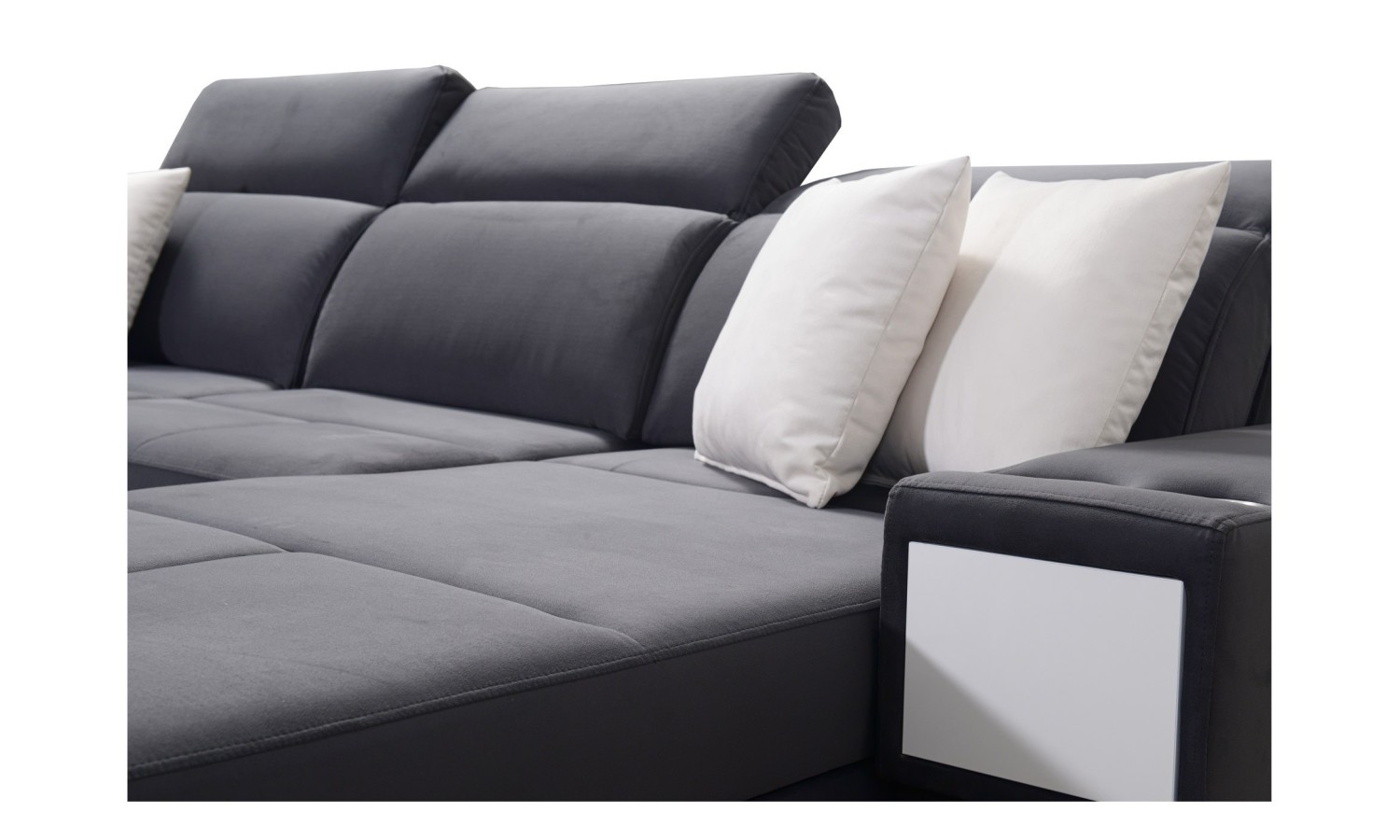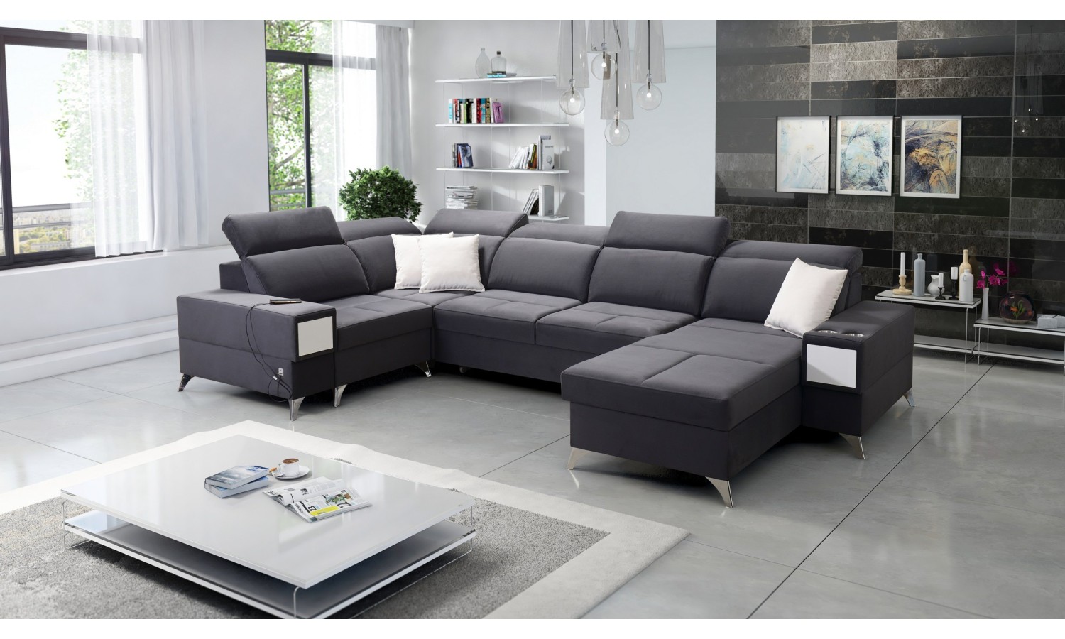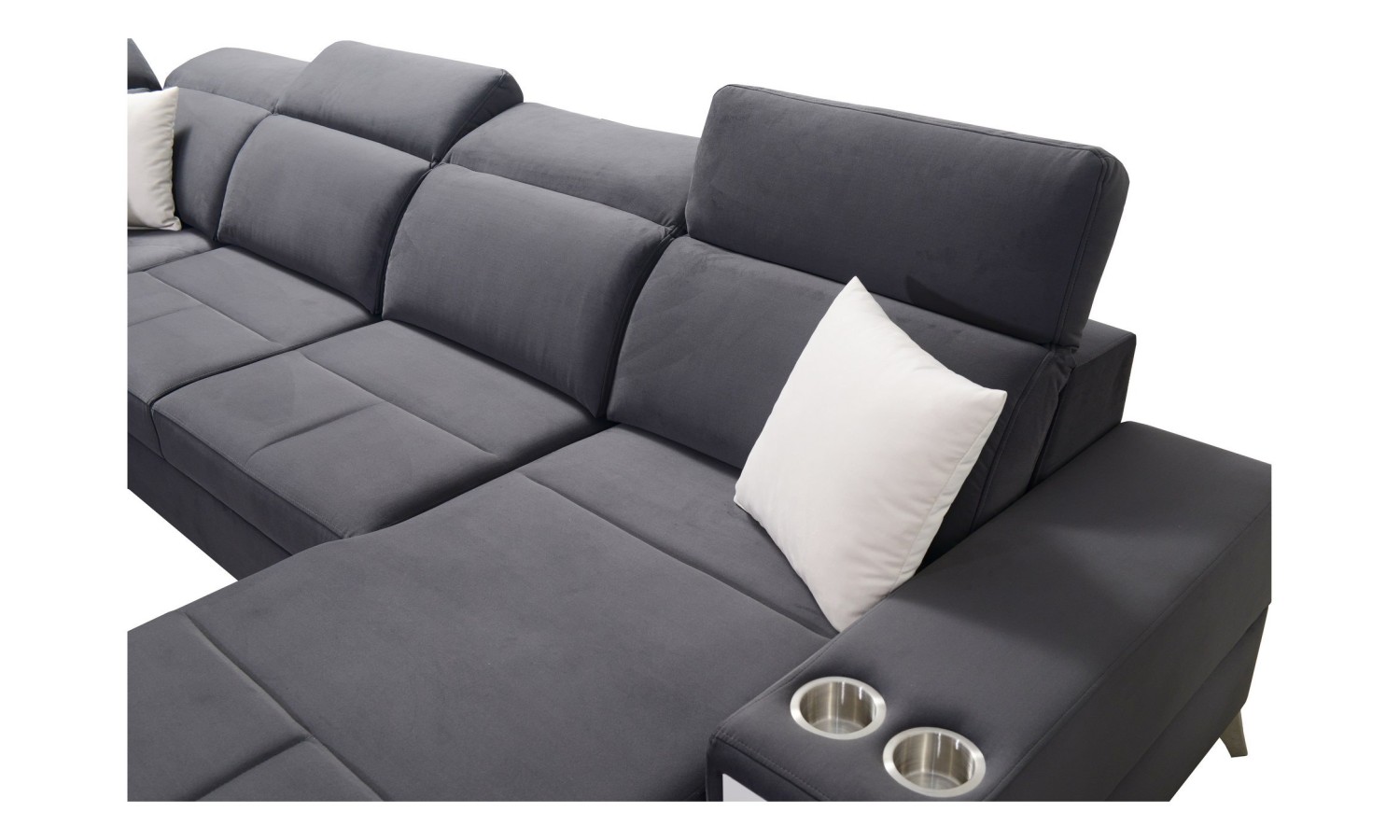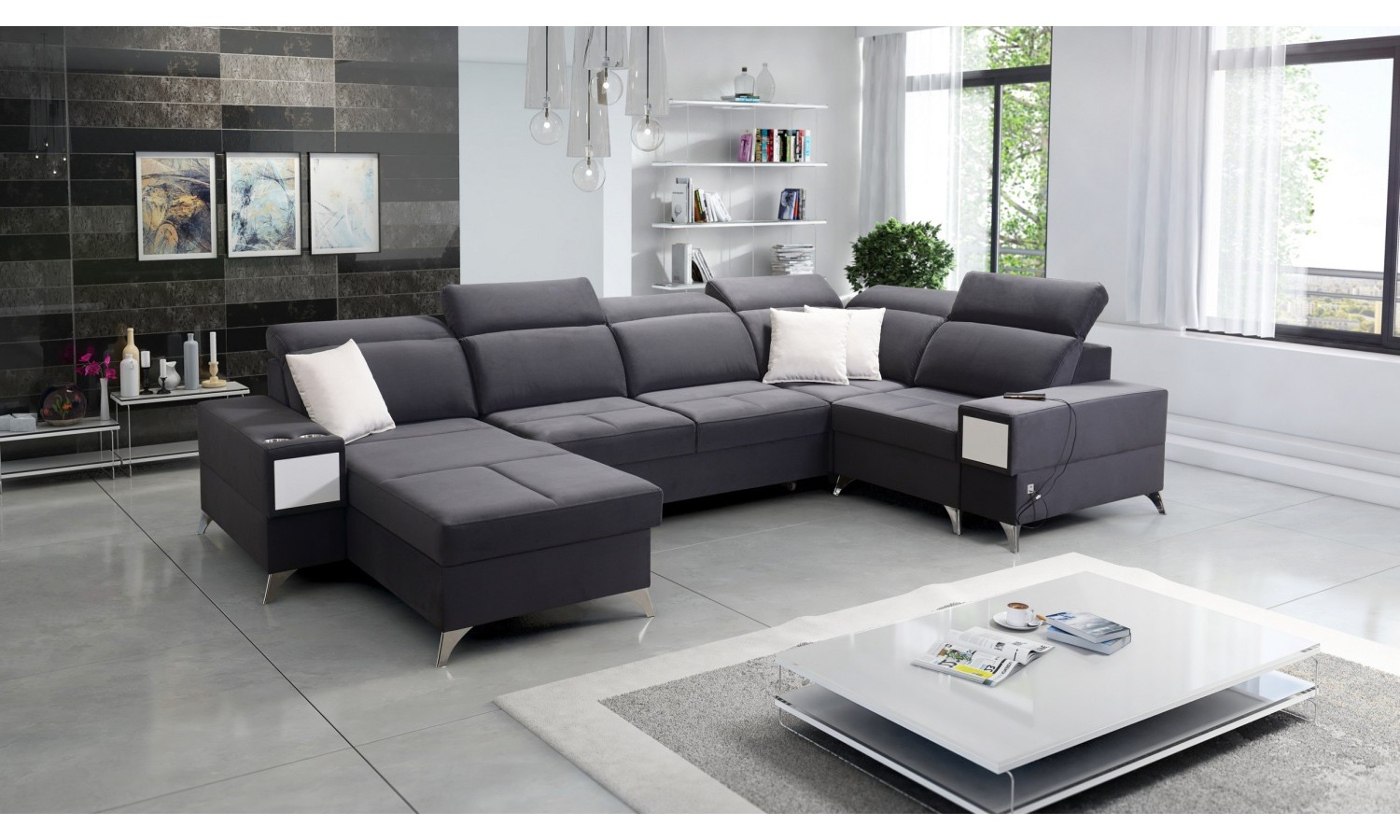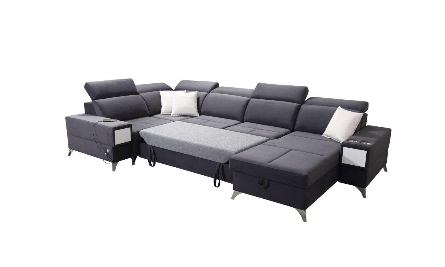 Narożnik Bahama IV wyróżnia się unikalnym kształtem litery U, co pozwala na optymalne wykorzystanie przestrzeni w salonie. Jego duże wymiary sprawiają, że jest idealnym wyborem dla dużych rodzin lub osób, które często przyjmują gości. Wykonany z miękkiej, ale trwałej tkaniny, oferuje komfortowe miejsce do relaksu. Funkcja rozkładania pozwala na łatwe przekształcenie narożnika w przestronne łóżko, a wbudowane schowki zapewniają dodatkowe miejsce na przechowywanie pościeli.