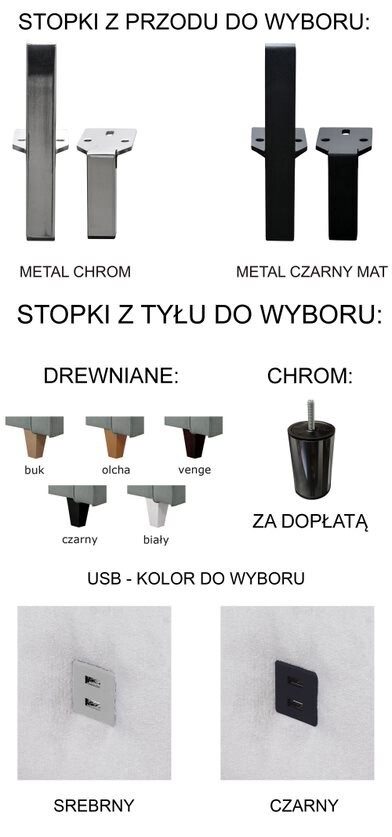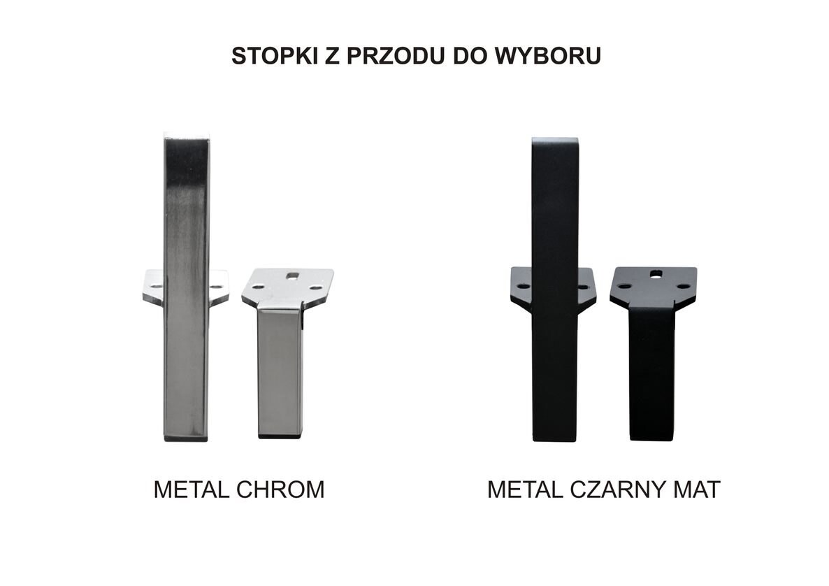 - Nóżki z przodu: metalowe, chromowane lub czarne. Nóżki z tyłu: drewniane lub metalowe (metalowe za dopłatą + 100 zł)
