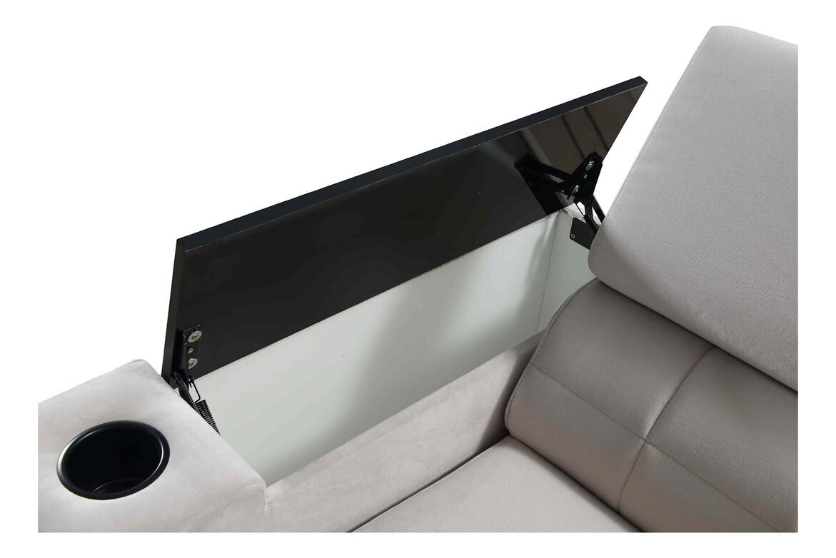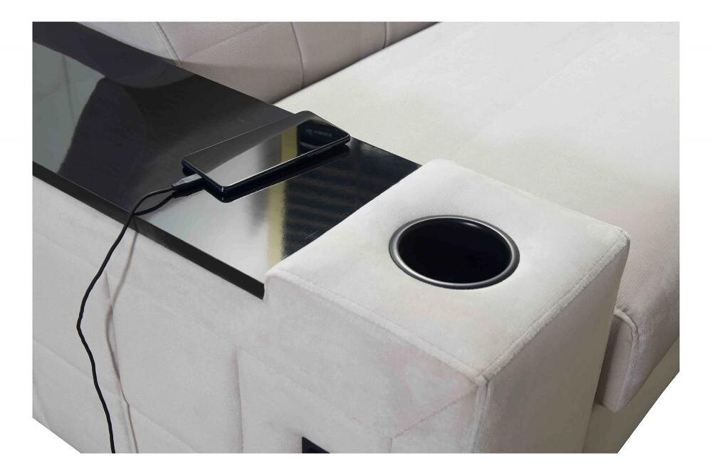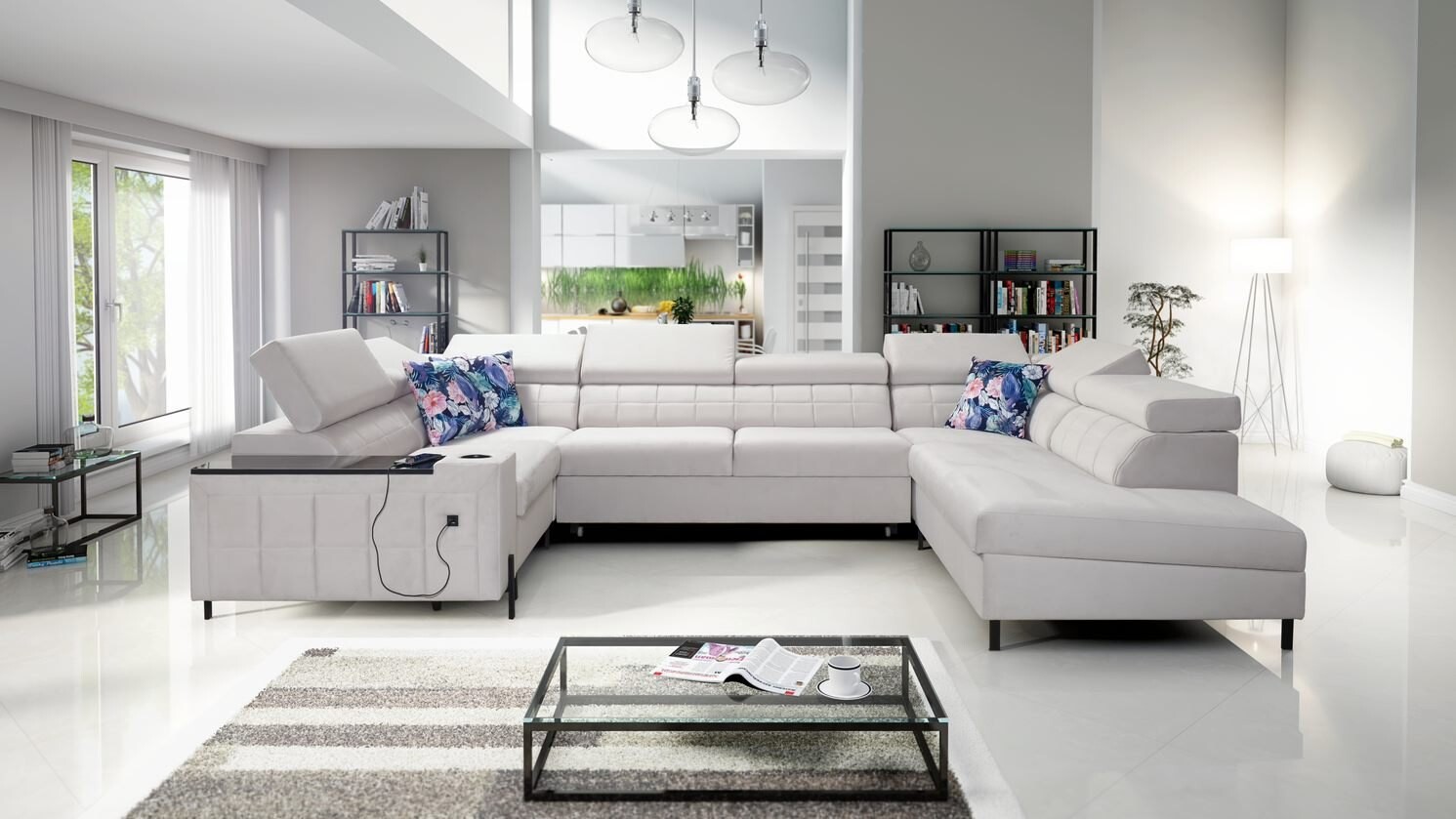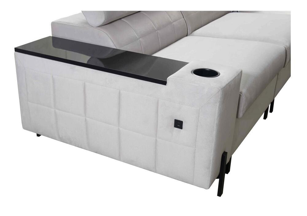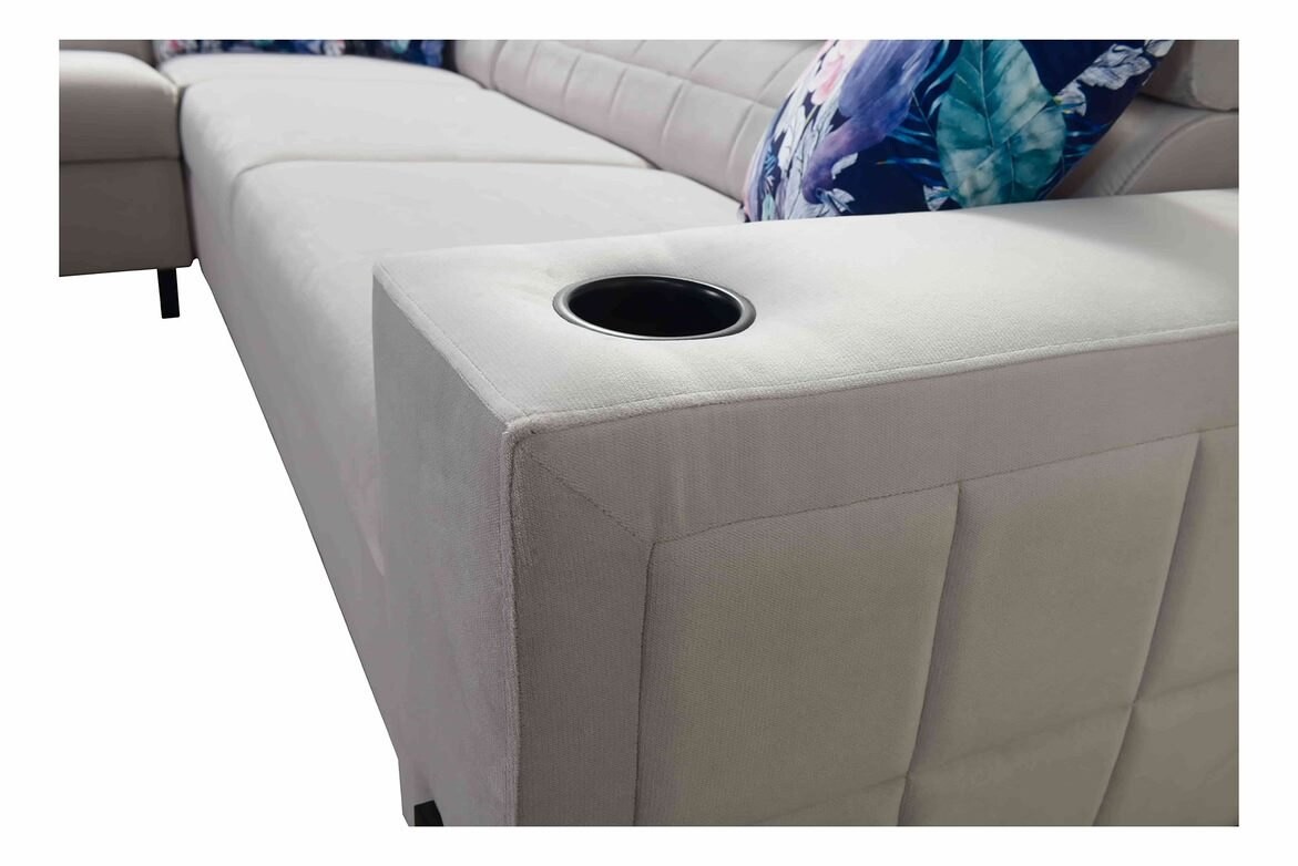 Dodatkowe funkcje, takie jak otwierany barek, kubek pod napoje dostępny w kolorze czarnym lub srebrnym, port USB oraz półki w 10 kolorach do wyboru, sprawiają, że narożnik jest niezwykle praktyczny. Istnieje także opcja dokupienia materaca Top (125x202 cm, wys. 5 cm) wyrównującego powierzchnię spania za dodatkową opłatą