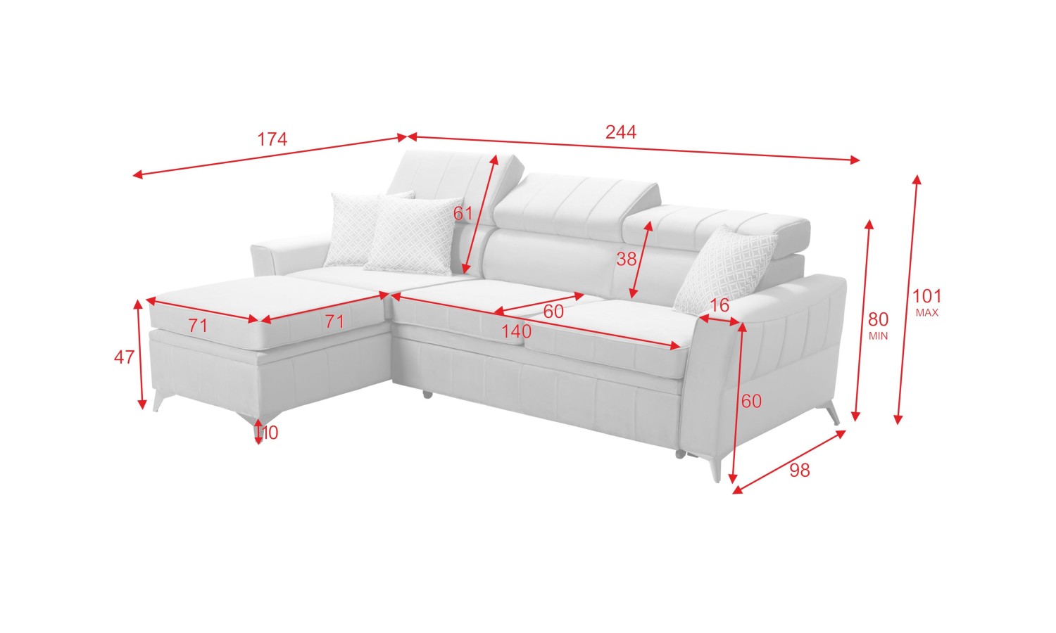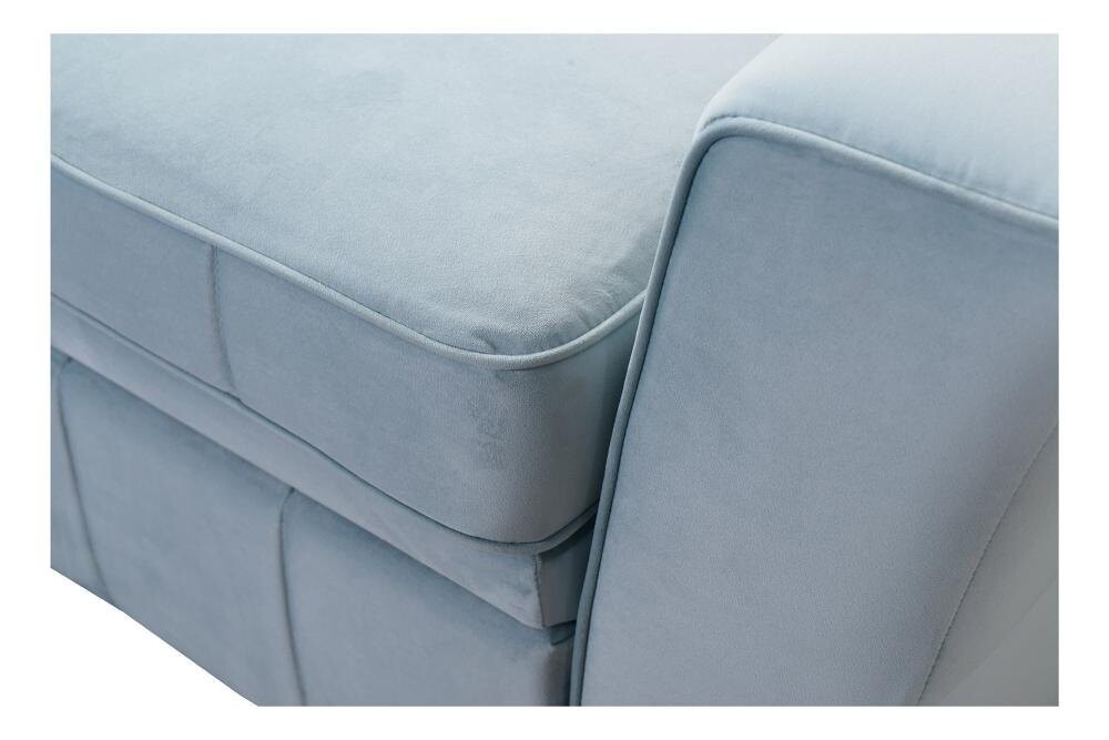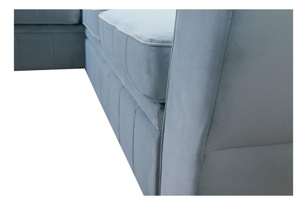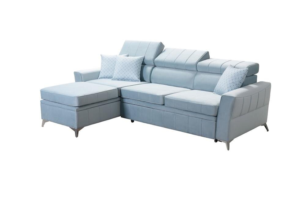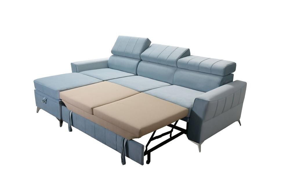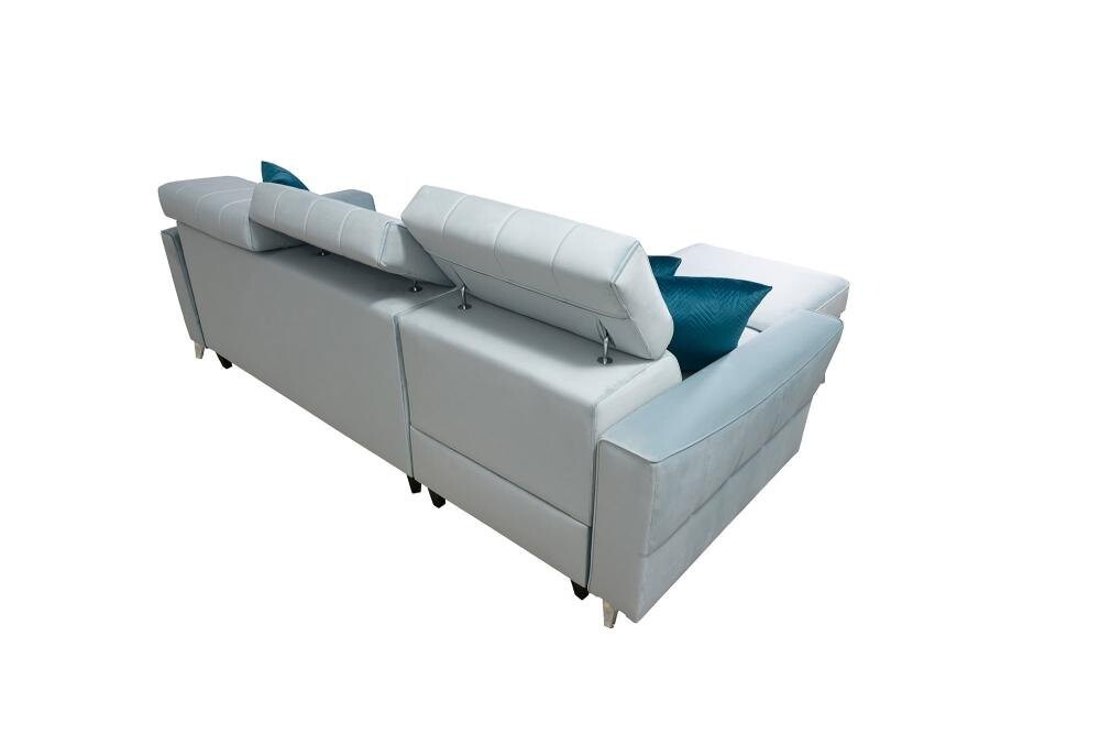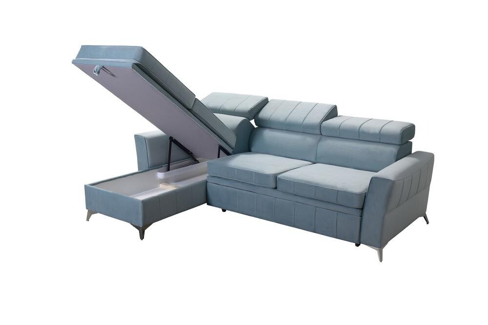 Solidny stelaż narożnika z drewna i płyty zapewnia stabilność, a regulowane zagłówki pozwalają na dopasowanie do indywidualnych potrzeb. Funkcja spania oraz duży pojemnik na pościel czynią Tuluza I praktycznym wyborem do mniejszych przestrzeni. Za dodatkową opłatą 120 zł można wykonać powierzchnię spania z tej samej tkaniny co cały narożnik, co zapewnia spójny wygląd.